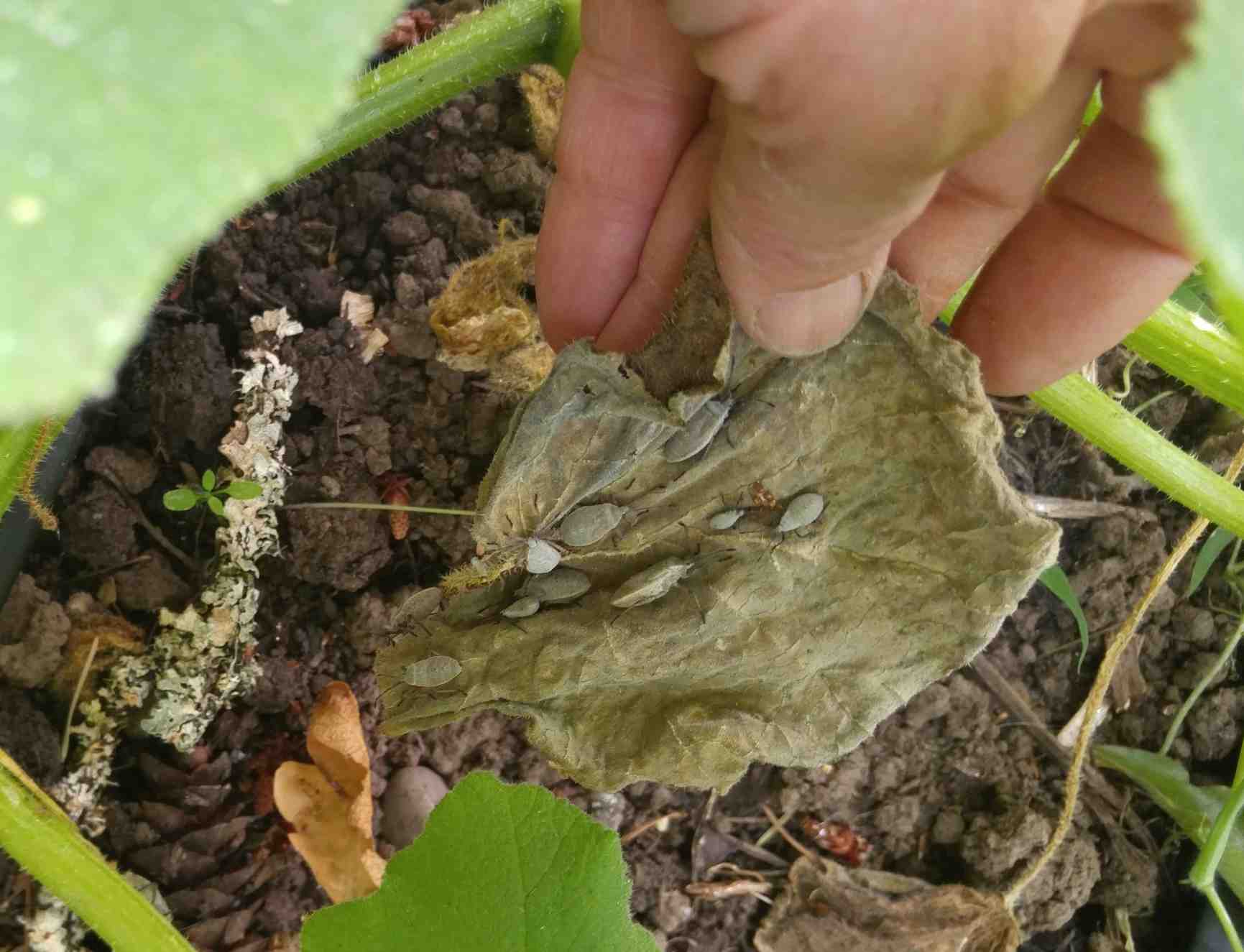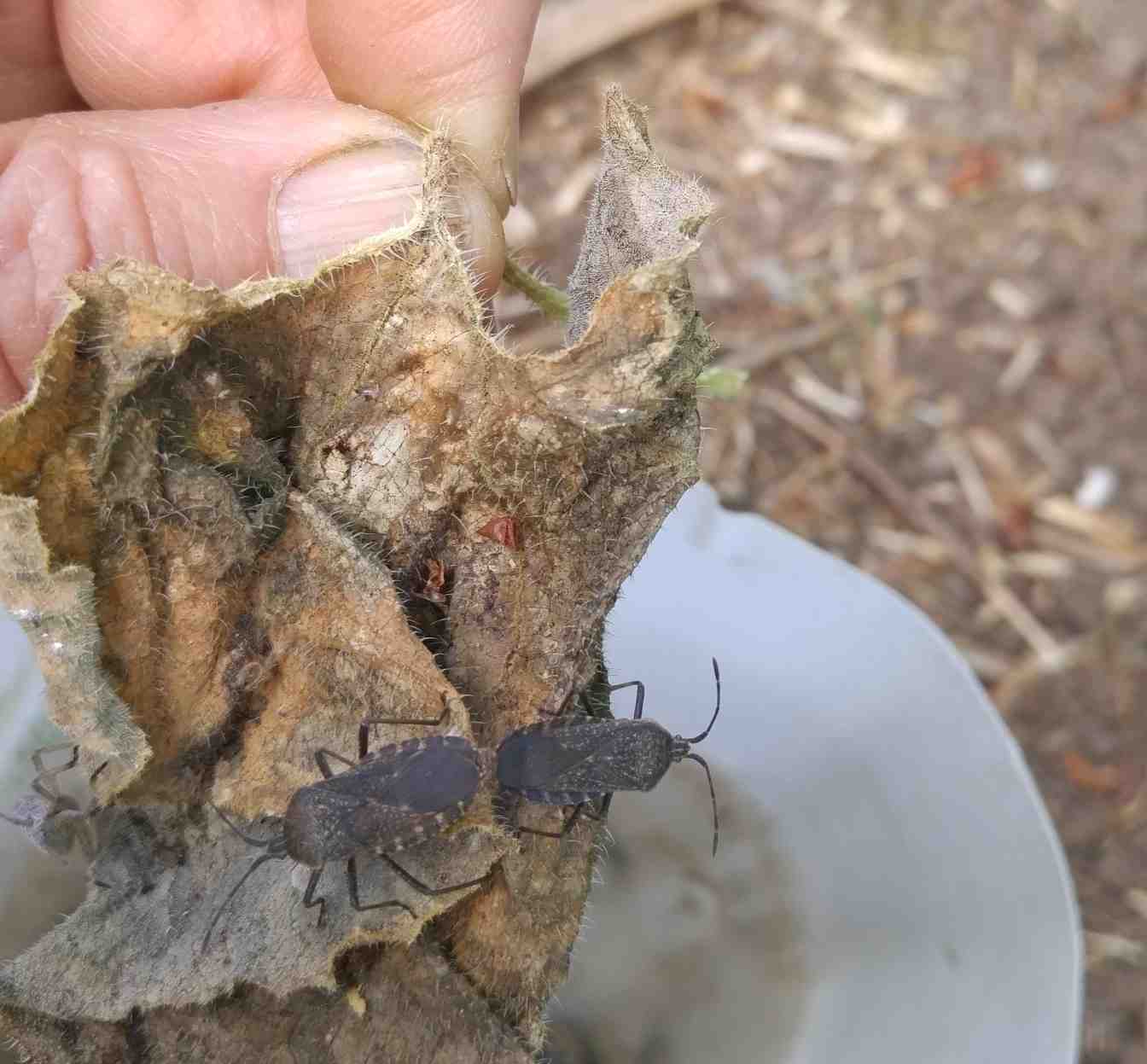 If you turn over a leaf with a brown spot be prepared to find a cluster of squash bug nymphs. They are soft and easy to squish, but large masses of them are repulsive. If you carefully place the leaf above a bucket of soapy water and give it a sharp tap, all of the bugs will fall into your bucket and the leaf will remain intact. Those that you miss will likely be back in the same spot the next day.
