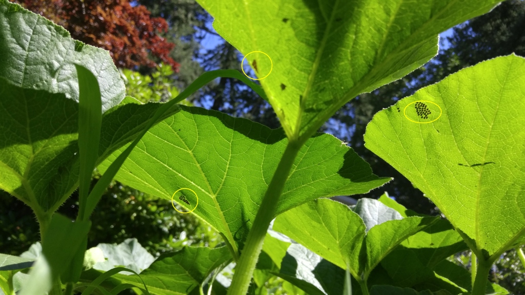 After the reports from my neighbors, I started surveying in mid-July after my vines were starting to size up and were beginning to flower and set fruit. I found plenty of eggs. Scraping them off the leaves with a fingernail or a stick effectively suppresses them, but you have to find them all. The gestation time for the eggs is about 10 days, give or take a couple of days depending on the temperature. If you check three or four times a week, you have a good chance of finding most of them before they hatch, but as the squash plants get bigger it gets progressively harder to search everywhere and find them all.