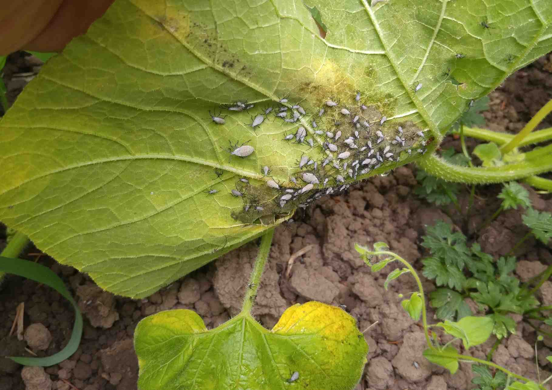 The squash bug nymphs are gregarious, initially forming clusters of small nymphs on the underside of the leaf where the eggs were laid. They start sucking plant juice and injecting enzymes into the leaf that causes damage and wilt. So it you miss the eggs, the next thing to look for are wilt and and brown spots on the surface of leaves.