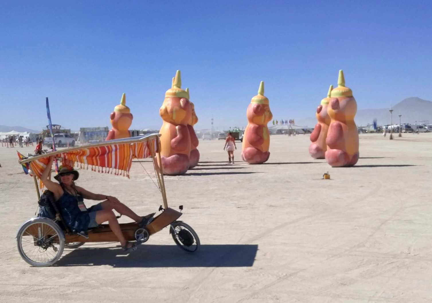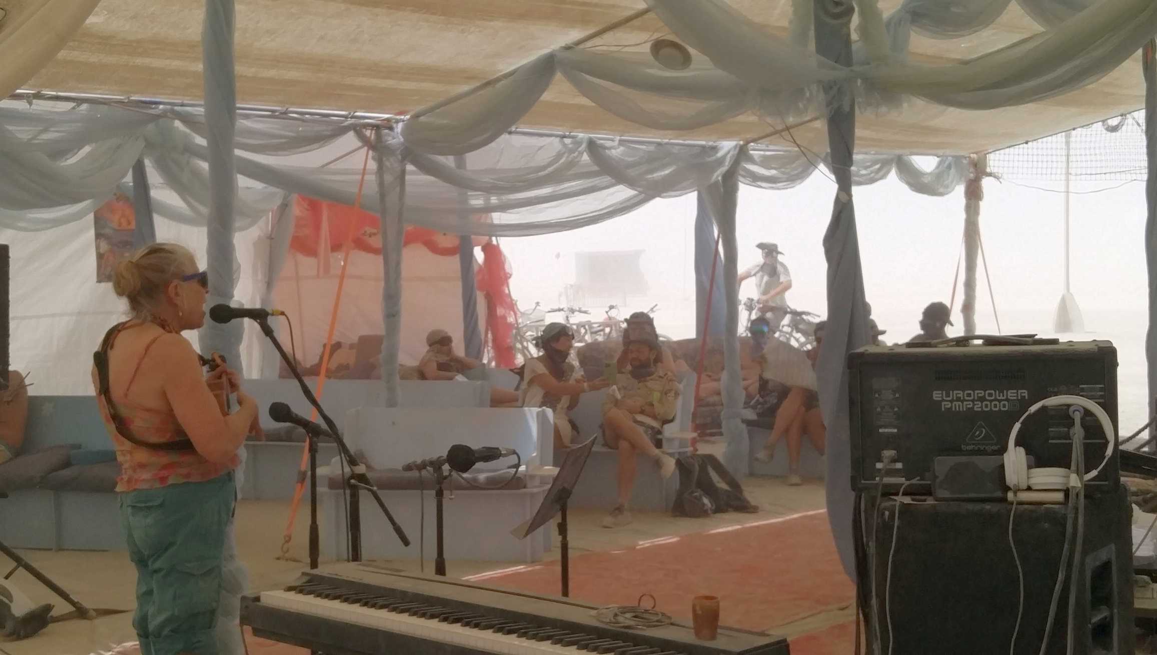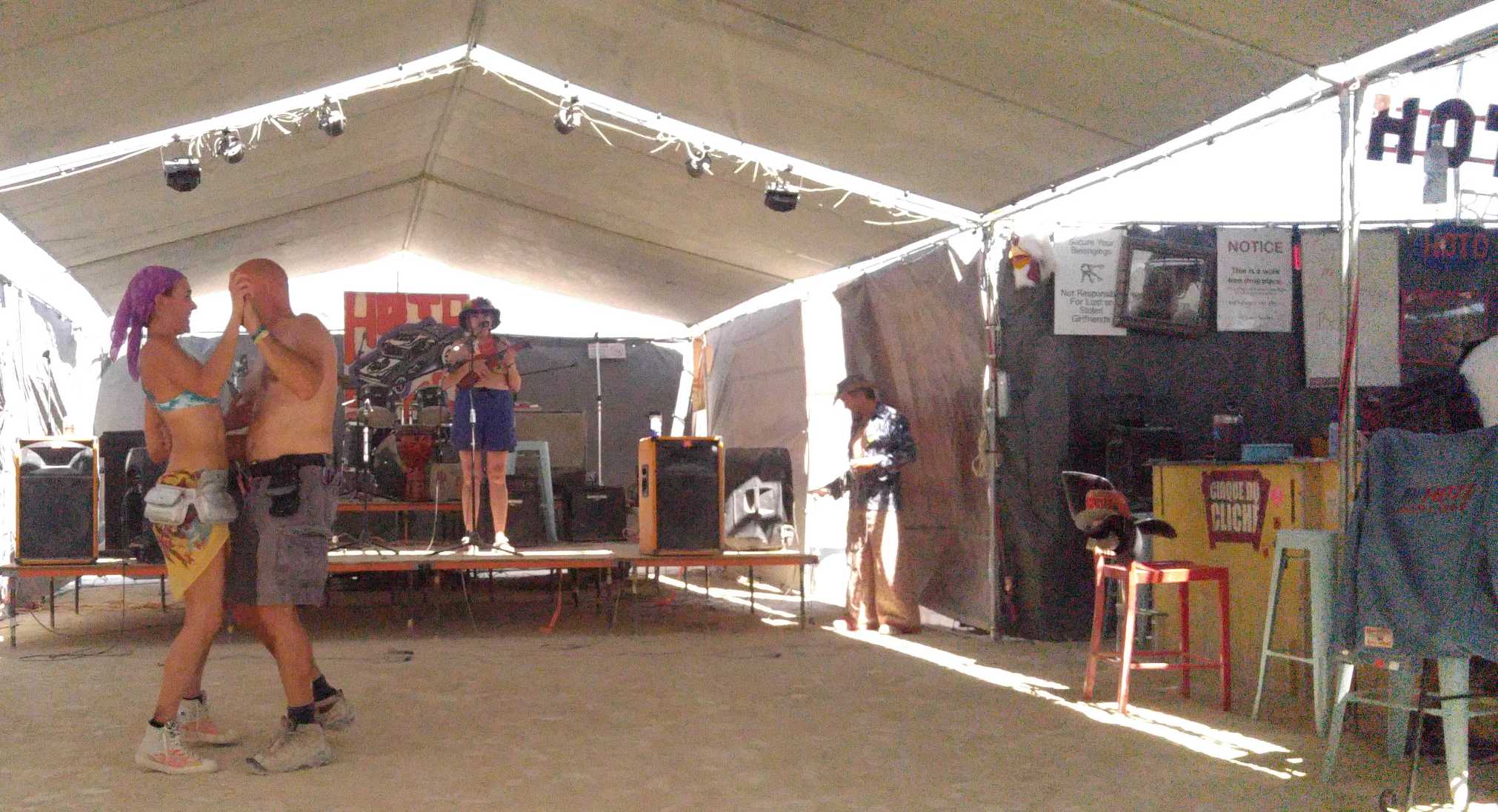The thump-thump of a techno bass line never leaves the playa, but there are a few places of respite. One night we found RootPile, a live bluegrass band, and the Jazz Station provided an evening’s entertainment as well. During the day, Ellen found performance spaces at HOTD (Hair of the Dog) and The Lost Penguins. The Lost Penguins became a daytime hangout when it was too hot and dusty, with endless water, lemonade, Penguin Pee (vodka and lemonade) and snow cones, with good musicians stopping by to play with Luap and the other Penguin musicians.