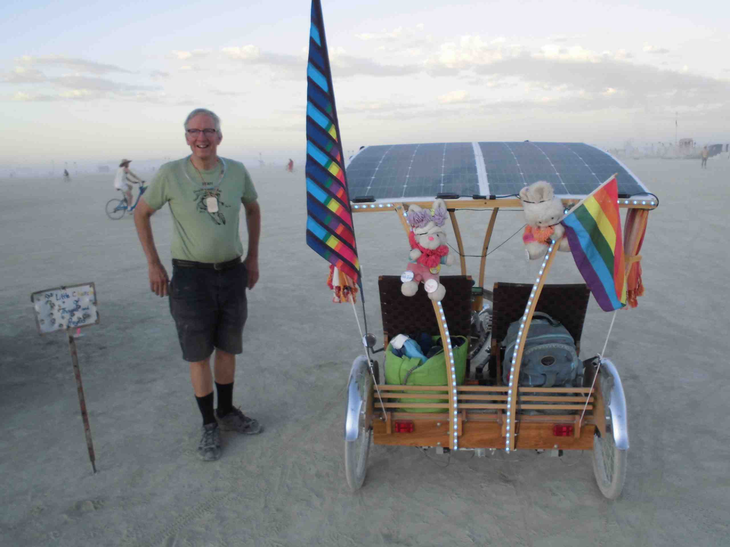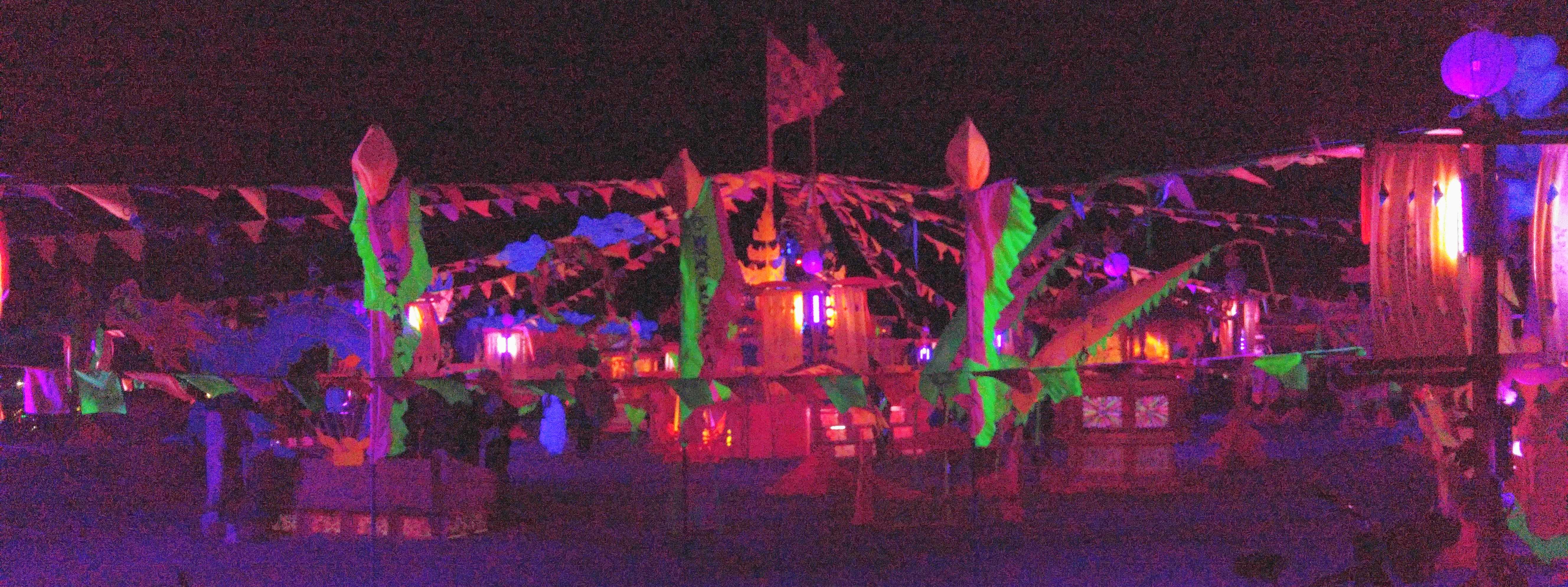 The first dust storm destroyed the pop-up shade garage. But the rest of the little home on the playa survived the big dust storm on burn day. A minor accident with the DateTrike broke the solar canopy supports so we were open to the stars on burn night and on the Sunday temple burn. (click on the montages below to scroll through the full size images)
