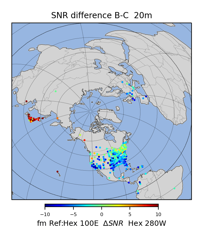 The images above show the comparisons for the hex beam with itself turned from 100°E to 280°W. Even though the reference antenna, the inverted L, has a very strong variation in response on the 20m band near 90°E, that variation is almost completely washed out when making grid-by-grid averaged comparisons for the two hex directions. There is more scatter in the data as you can tell from the width of the band of points on the polar graphs and the size of the error bars, but basic front-to-back directivity of the antenna clearly shows up.