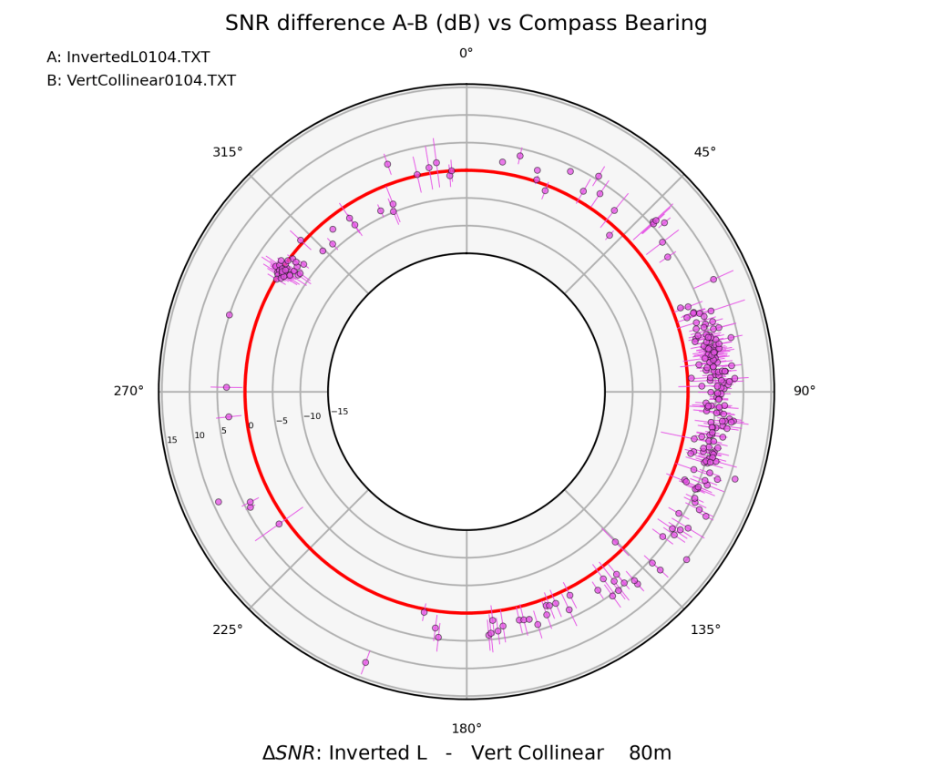 The best way to see what the program does is to look at some sample data from my antennas. Below I show some data collected from my Inverted-L big wire that is up in the trees about 100 ft. high, compared with my vertical collinear 20m antenna. The vertical is an axisymmetric antenna so there is little reason to think there is any directional preference coming from this antenna. The first thing we can do with the program is to look at all of the averaged SNR differences on a polar plot. The program also provides summary averages overall of the data by band.