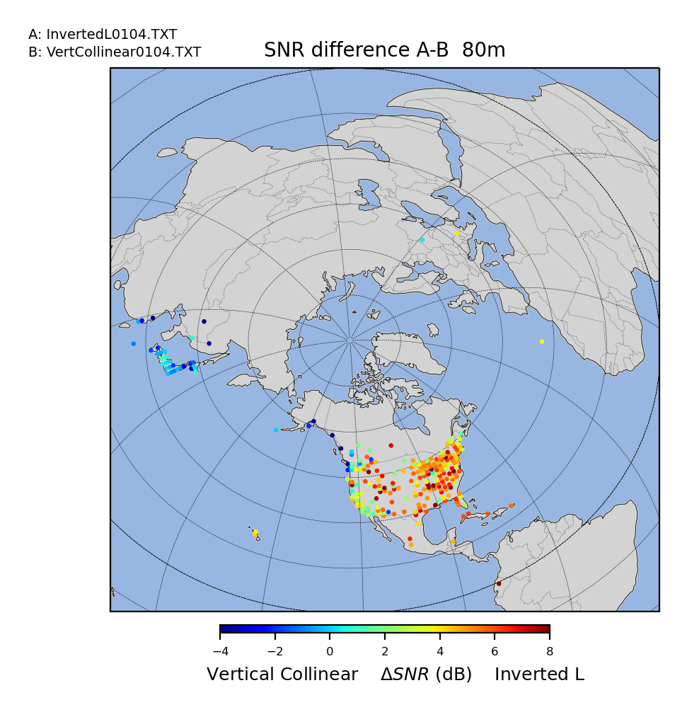 allplot takes its name from the ALL.TXT files that the WSJT-X software generates in normal operation. The ALL.TXT file is a log of everything received and sent by the program. The reception reports include a time stamp, the station call sign, often a grid square locator, and the SNR report. A typical experiment involves collecting two simultaneous sets of reception reports, using two receivers, from two separate antennas that can then be compared. The allplot program accepts the two ALL.TXT files, finds all of the simultaneous transmissions received by both antennas, matches up grids and callsigns, looks at differences in the SNR reports and generates averages over grid square locations…and so on.