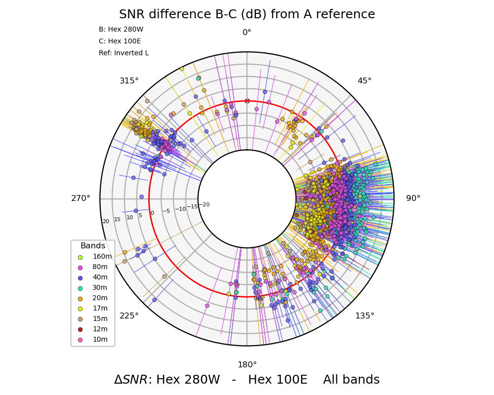The images above show the comparisons for the hex beam with itself turned from 100°E to 280°W. Even though the reference antenna, the inverted L, has a very strong variation in response on the 20m band near 90°E, that variation is almost completely washed out when making grid-by-grid averaged comparisons for the two hex directions. There is more scatter in the data as you can tell from the width of the band of points on the polar graphs and the size of the error bars, but basic front-to-back directivity of the antenna clearly shows up.
