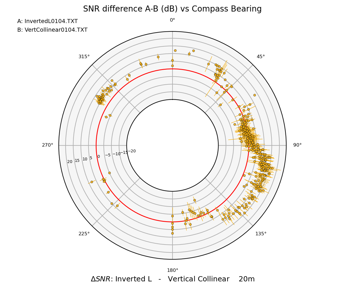 The best way to see what the program does is to look at some sample data from my antennas. Below I show some data collected from my Inverted-L big wire that is up in the trees about 100 ft. high, compared with my vertical collinear 20m antenna. The vertical is an axisymmetric antenna so there is little reason to think there is any directional preference coming from this antenna. The first thing we can do with the program is to look at all of the averaged SNR differences on a polar plot. The program also provides summary averages overall of the data by band.