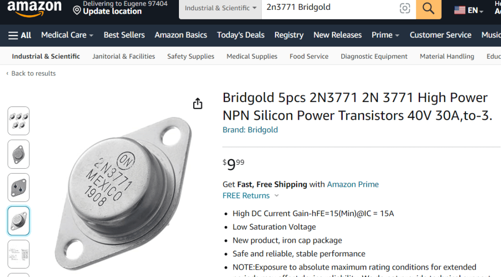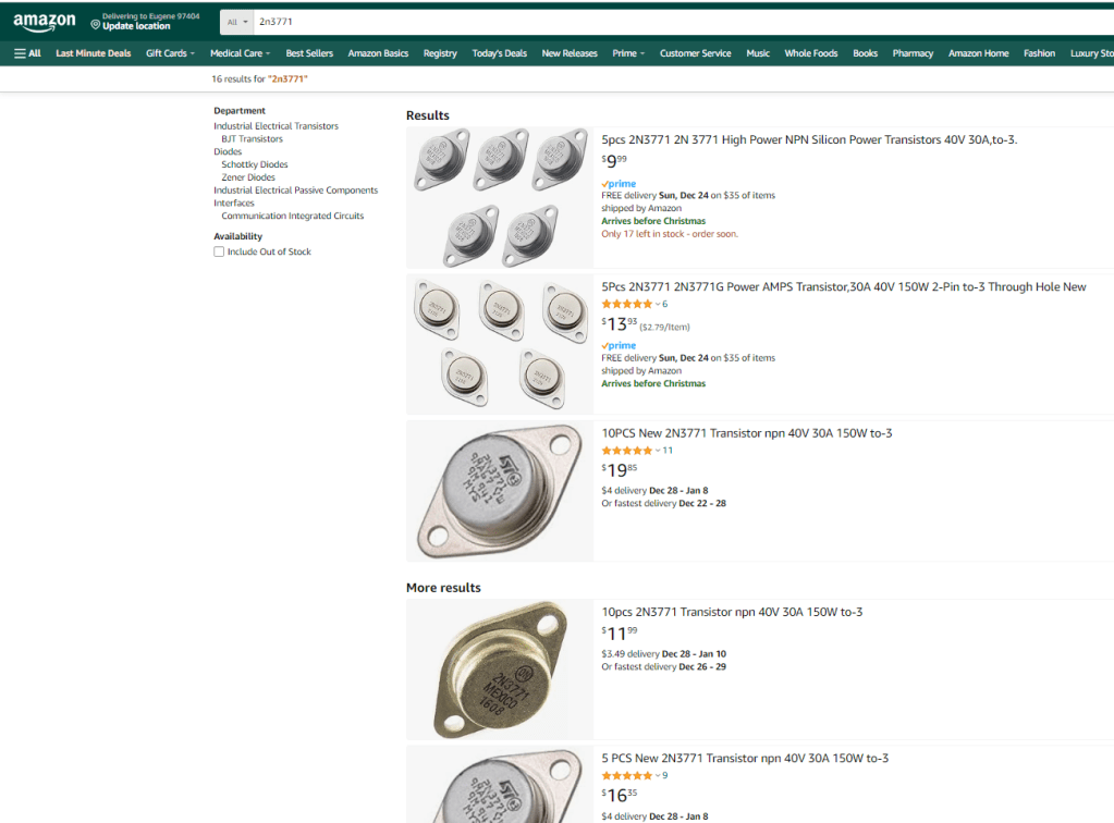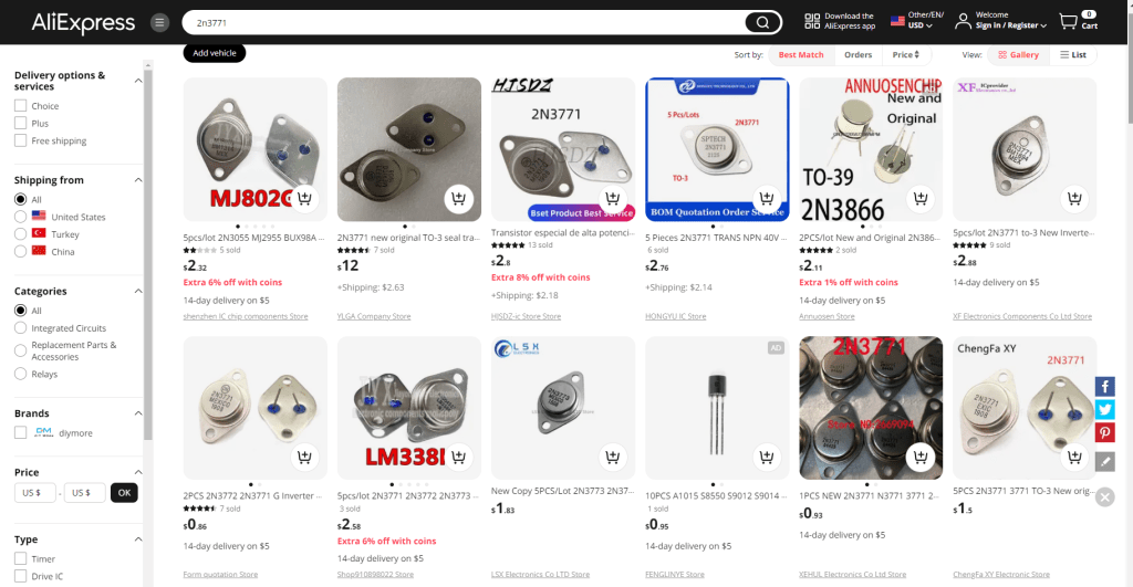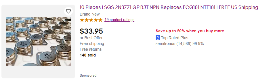 If you were an eBay seller in the US and wanted to sell some 2N3771’s you could look over on alibaba.com or Aliexpress, the Chinese online marketplace and business bazar for the parts.