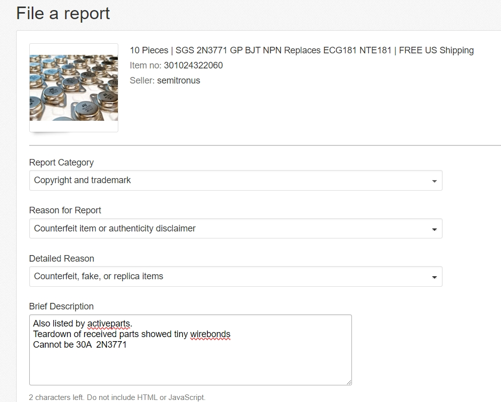 One lesson I learned with this event is the extent to which eBay is engineered to let this kind of thing happen. Although they have a User Agreement that sets out what buyers and sellers can and can’t do, there is not much in it that restricts sellers from lying in their listings.[2] What eBay is concerned about is willfully allowing for trademark infringement because they could be liable for knowingly allowing sales of counterfeit or trademark infringing goods on their platform. To that end, they have the Verified Rights Owner (VeRO) program which allows the trademark owners to request removal of listing they feel are infringing on their intellectual property. The fraudulent semiconductor merchant I ran into did indeed defraud the SGS-Thompson brand with the ST logo on the goods they sold, but buyers have no method or standing to report such an infringement at eBay. The JEDEC specification for a 2N3771 transistor was also not met in the parts marked with the 2N3771 part number, but that is not an intellectual property issue, that is just lying about what is inside the case of the part marked with “2N3771.” SGS-Thompson could take down this listing if they cared enough, but remember that an attorney would need to write some letters complaining about parts which the company no longer even make. The lawyer could be earning his pay much better negotiating purchase agreements with Boeing or General Motors for supply contracts worth real money.
