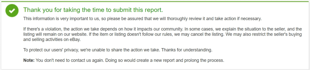 The form leads you down a very narrow decision tree. For instance if you claim “eBay item infringes on intellectual property rights,” you are instructed to use the VeRO reporting, only available to “rights owners.” In the “brief description” you are allowed 100 characters to make your case. Please hear no evil! Then you are left with a “trust us and don’t come back” message.