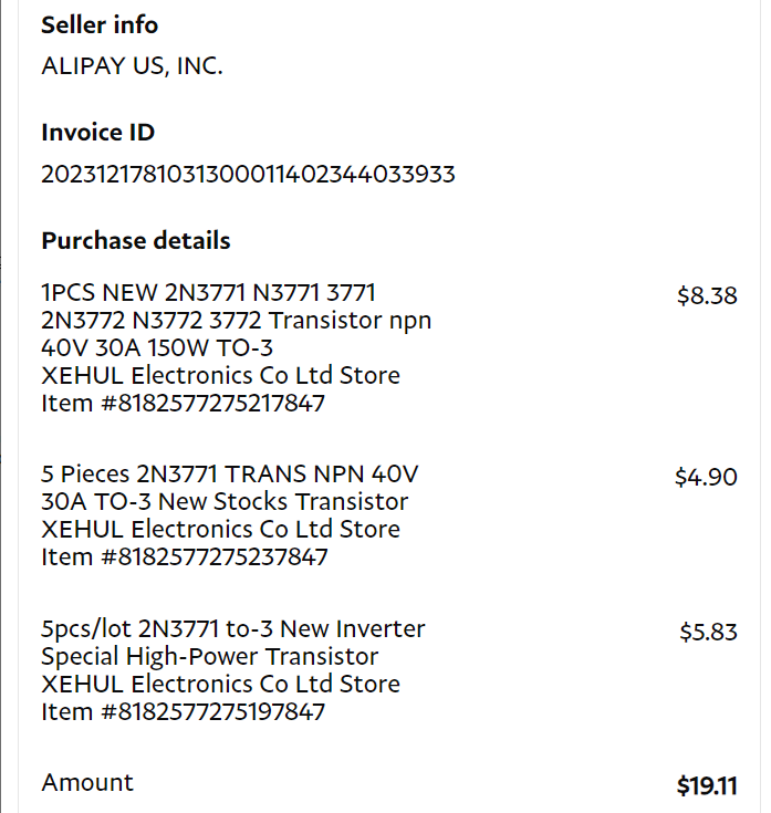 The little experiment buying the 2N3771’s from three different sellers on AliExpress also proved enlightening and also added more mystery. First, since I placed the orders at the same time, AliExpress consolidated the shipping so that all of the parts arrived in a single package with the three smaller packages inside. That made sense, but peculiar was my PayPal receipt.