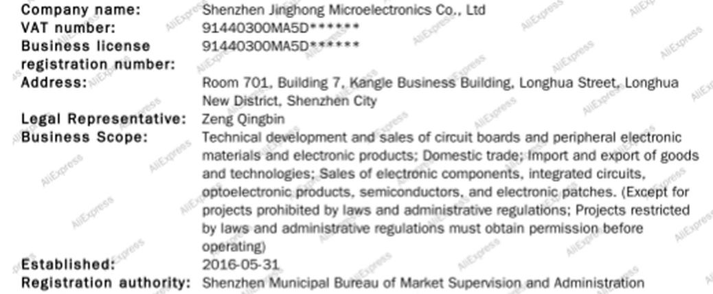 Note that all of the entries have the same XEHUL Electronics Store even though I bought from two other AliExpress vendors. Trying to Google the names of the stores gets you nowhere. However there is a small link to “Business License” when you hover over the store’s name on its home page that provides a small image with a real company name and a physical address.