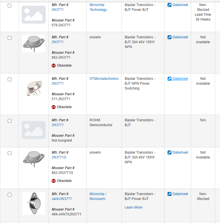 Into this fray I stepped when I bought ten 2N3771 power transistors to replace the ones on my Astron 35A power supply for my ham radio. I was noticing when transmitting, the voltage would suddenly drop down during the middle of the transmission, then recover when I stopped pushing power. I put the supply on the bench and determined that two of the four output transistors were not functioning. In this circuit, the four transistors are all in parallel so it is a good idea to replace them all at once with identical components. So I went to look for some new ones from a reputable supply house and came back with a lot of “Not Available.”