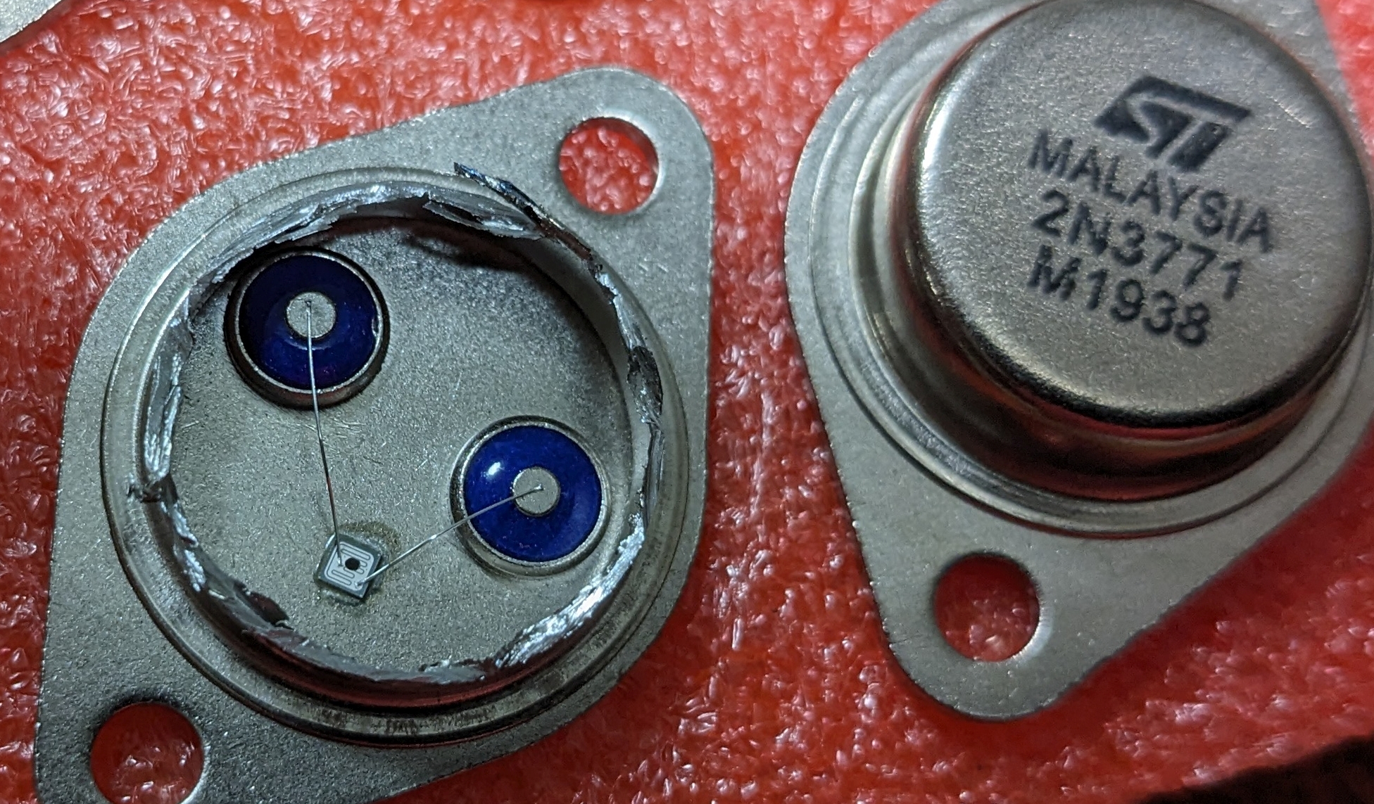 Comparing fakes, the one with the slightly bigger bond wires and die area (ON MEXICO 1908) is a much better part than the other one. If the equipment the part was used in had enough derating built into the design, the transistor might function for a while. But the transistor junction will get very hot when pushed at all. Repeated large thermal cycles will kill even the best parts, so if the fakes don’t fail immediately, they will after a few cycles. I was fortunate that when I put the parts of the other fake (ST MALAYSIA M1938) with tiny wirebonds into my supply, they failed the minute I turned on the power. Otherwise I might have thought everything was OK.