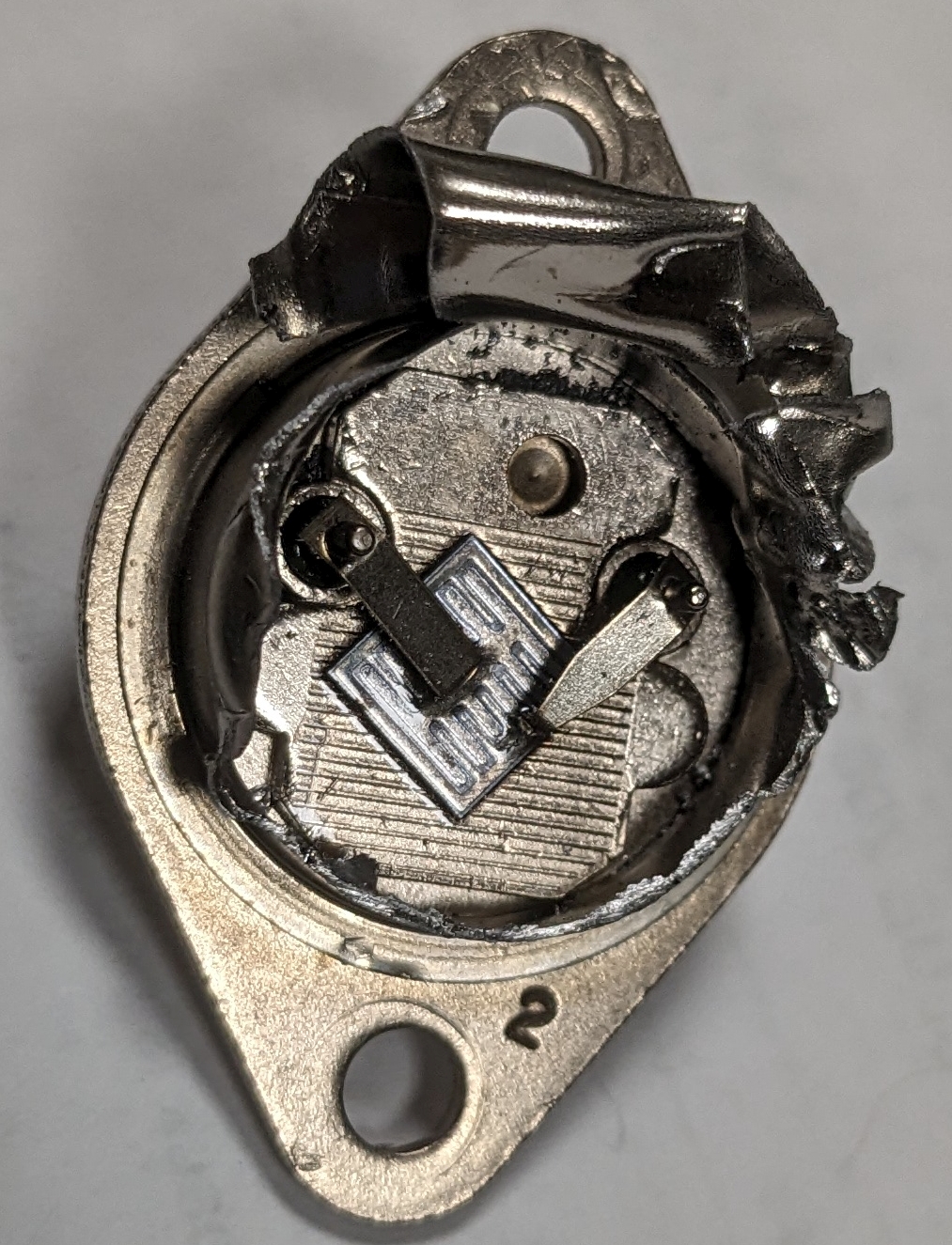 In both cases, note the “heat spreader” under the chip, a bulky chunk of copper to improve the heat conduction through the steel flange. The real parts weight several grams more than the fake ones because of that copper heat spreader. The main current carrying wire is the left-side one in the photos. You see a big strap in the 1980’s part and a large diameter wirebond in the newer part. Wirebonds are often a failure point in high current parts because they can fuse. The fusing current of round copper wires is well tabulated and gives you a direct measure of a common failure mode for the peak current capability of such a part.