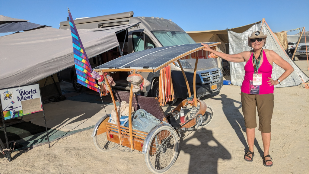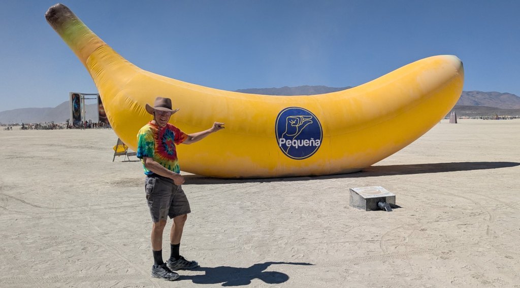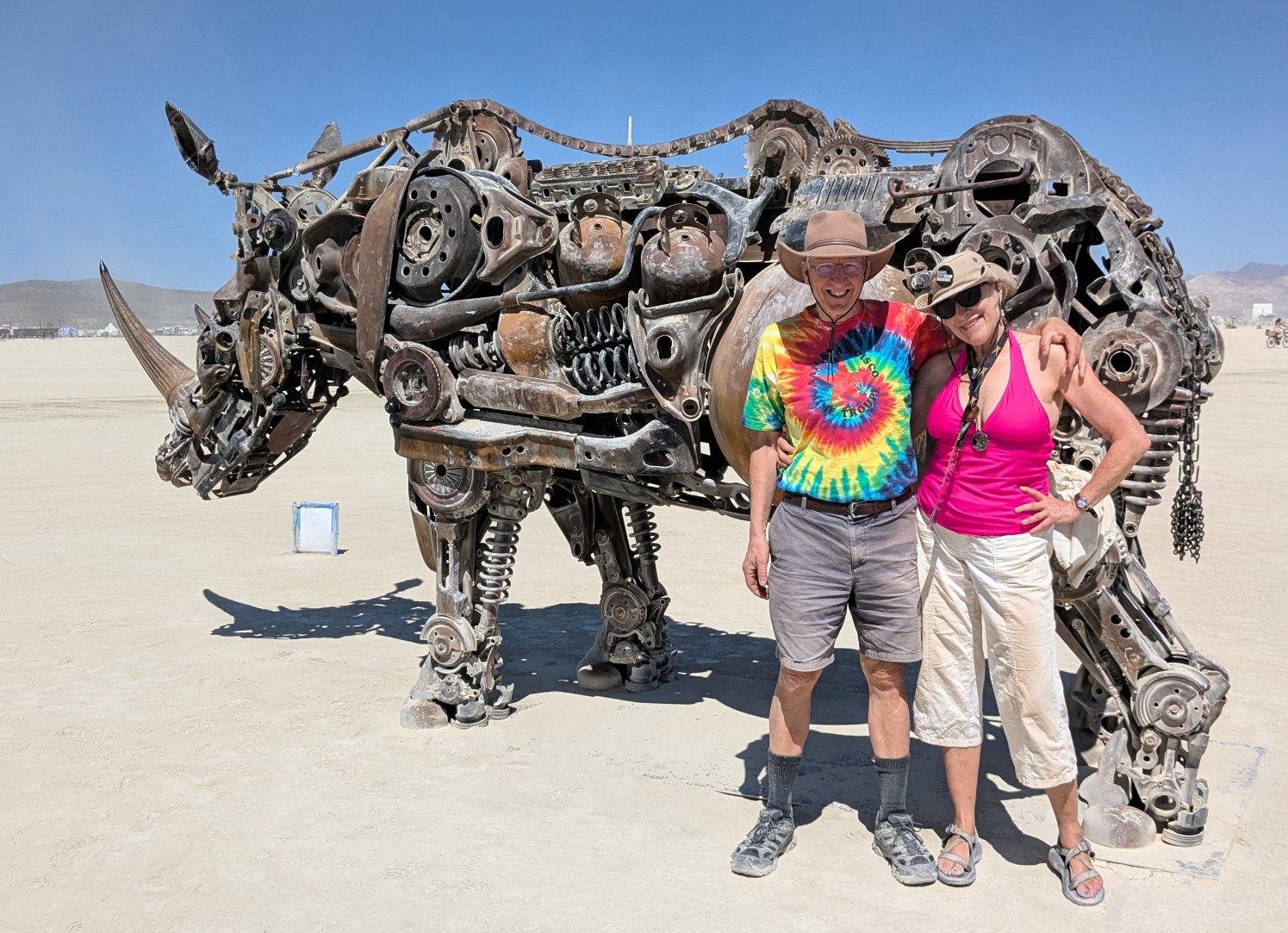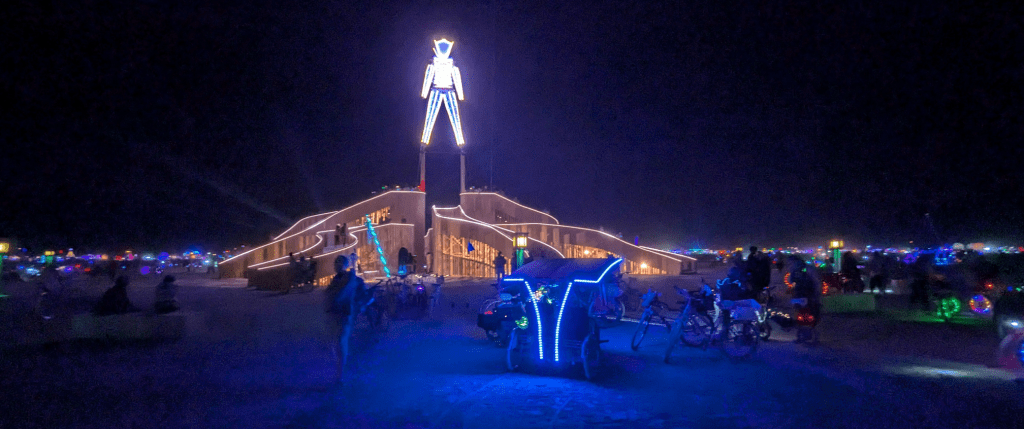 For the first time in several years there were tickets for sale until the last minute for Burning Man 2024. The mud fest last year seemed to discourage a few people. But this year was exceptionally nice, at least up until Sunday afternoon by which time we were long gone. From past experience, we’ve noticed we tend to burn out after awhile on the playa so we planned this year for about 5 days, arriving Tuesday evening with the plan to pack up Sunday morning after then Man burn. We arrived around 7:00 pm and after pitching the tent and building our camp we headed out to visit the Man. (click on images for full screen view – use browser Back button to return)
