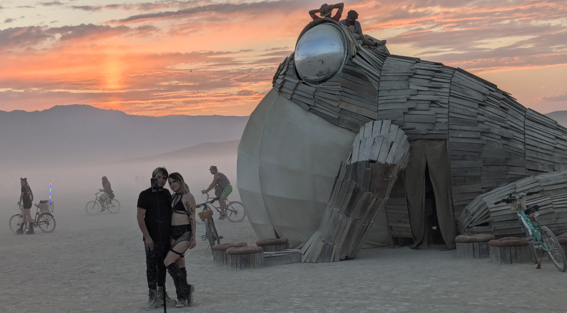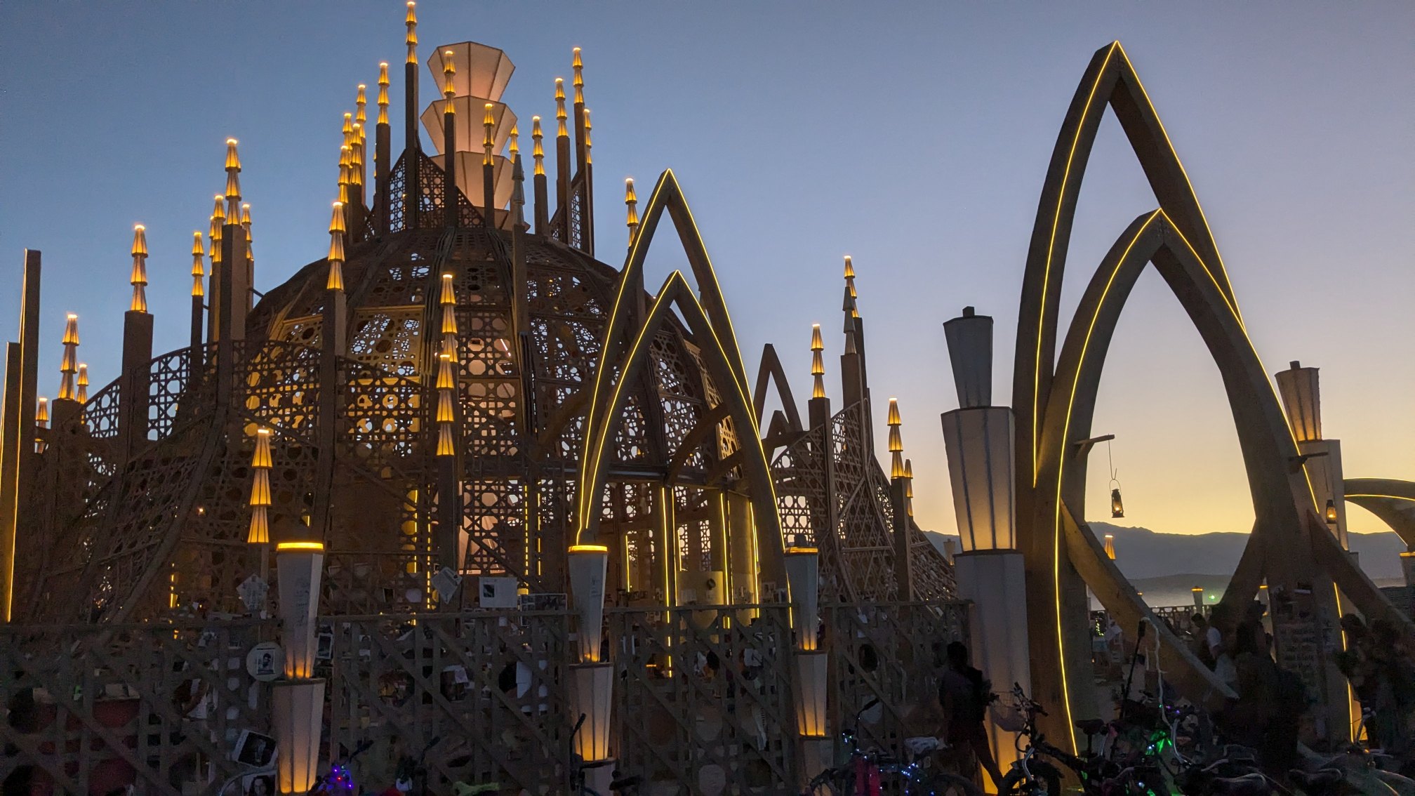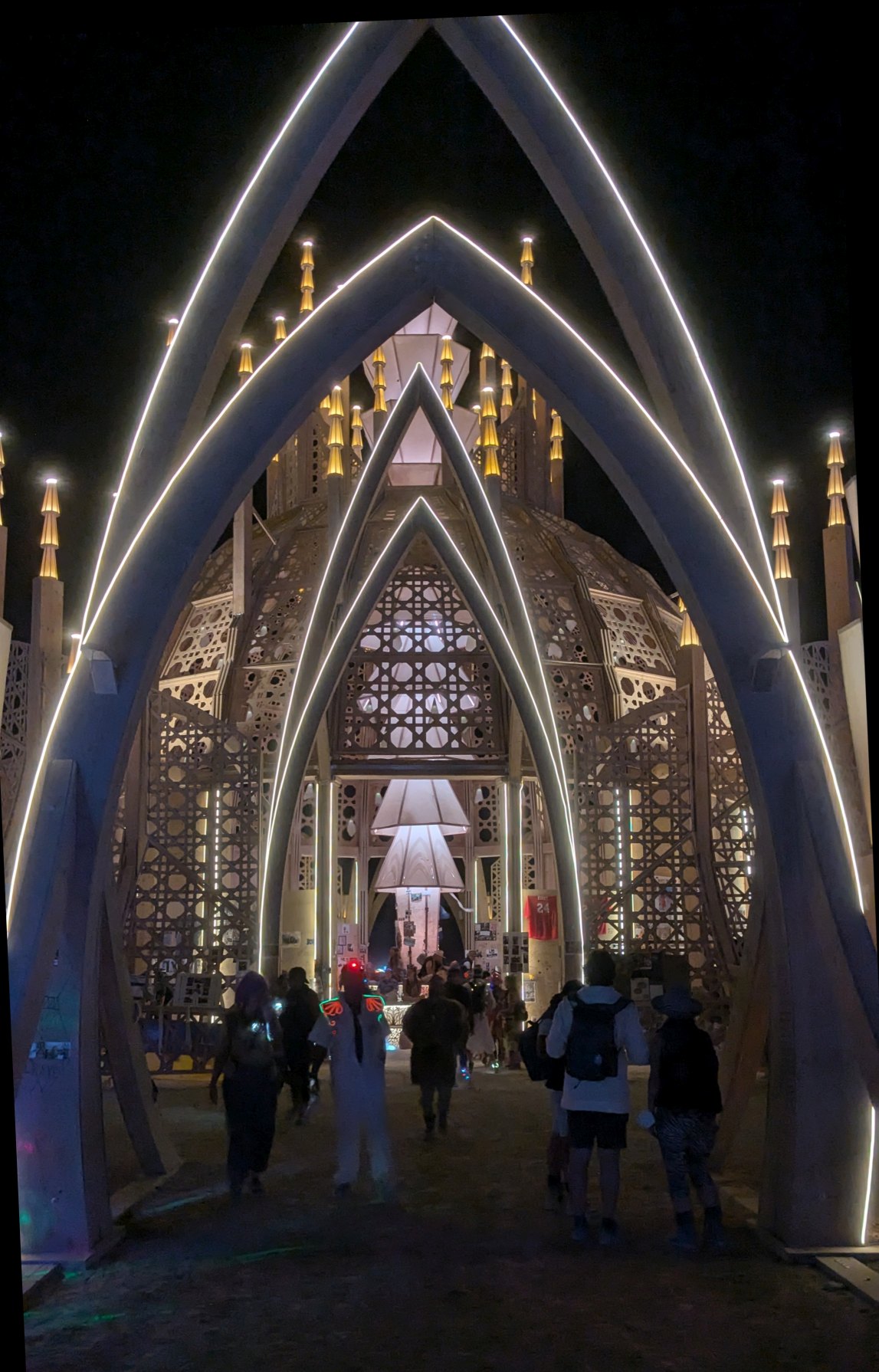 For the first time in several years there were tickets for sale until the last minute for Burning Man 2024. The mud fest last year seemed to discourage a few people. But this year was exceptionally nice, at least up until Sunday afternoon by which time we were long gone. From past experience, we’ve noticed we tend to burn out after awhile on the playa so we planned this year for about 5 days, arriving Tuesday evening with the plan to pack up Sunday morning after then Man burn. We arrived around 7:00 pm and after pitching the tent and building our camp we headed out to visit the Man. (click on images for full screen view – use browser Back button to return)