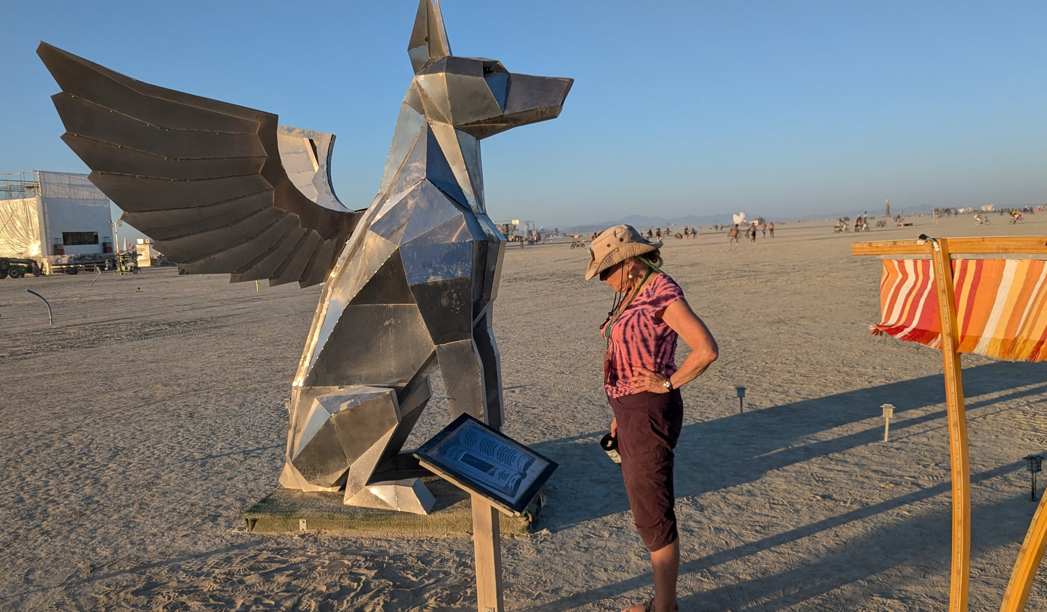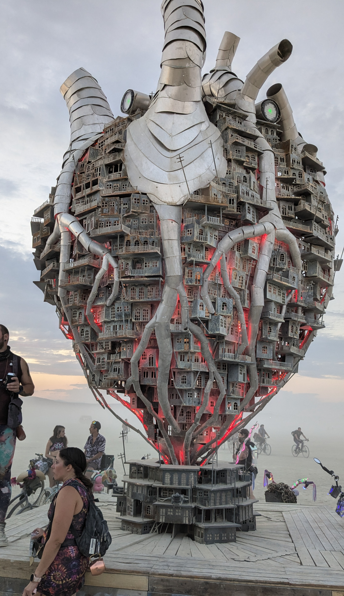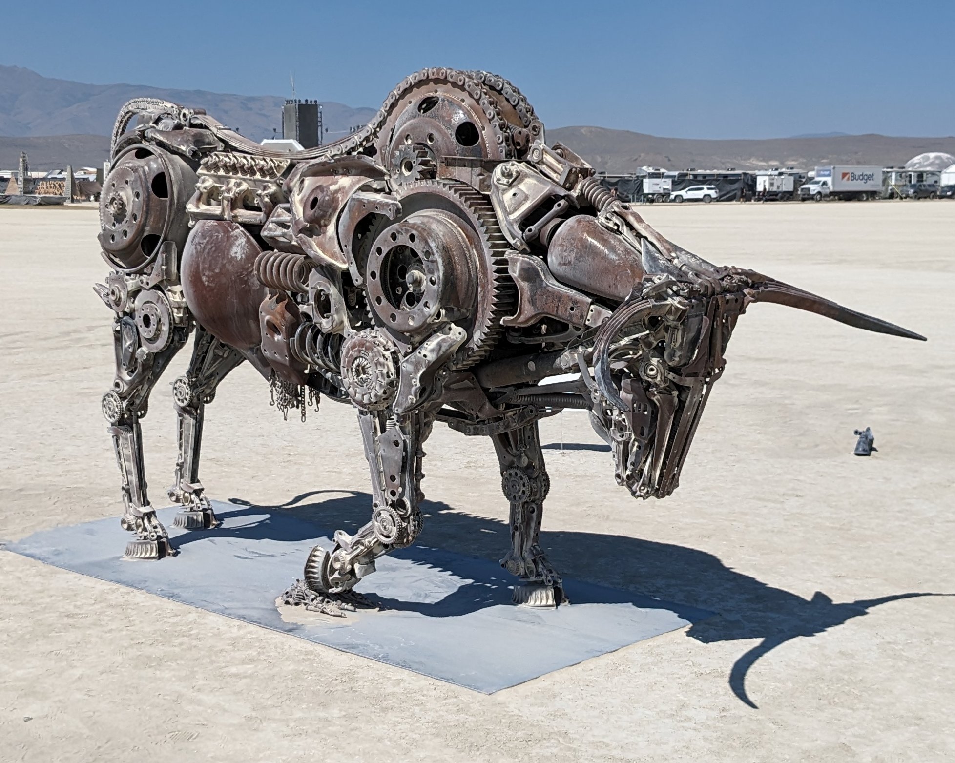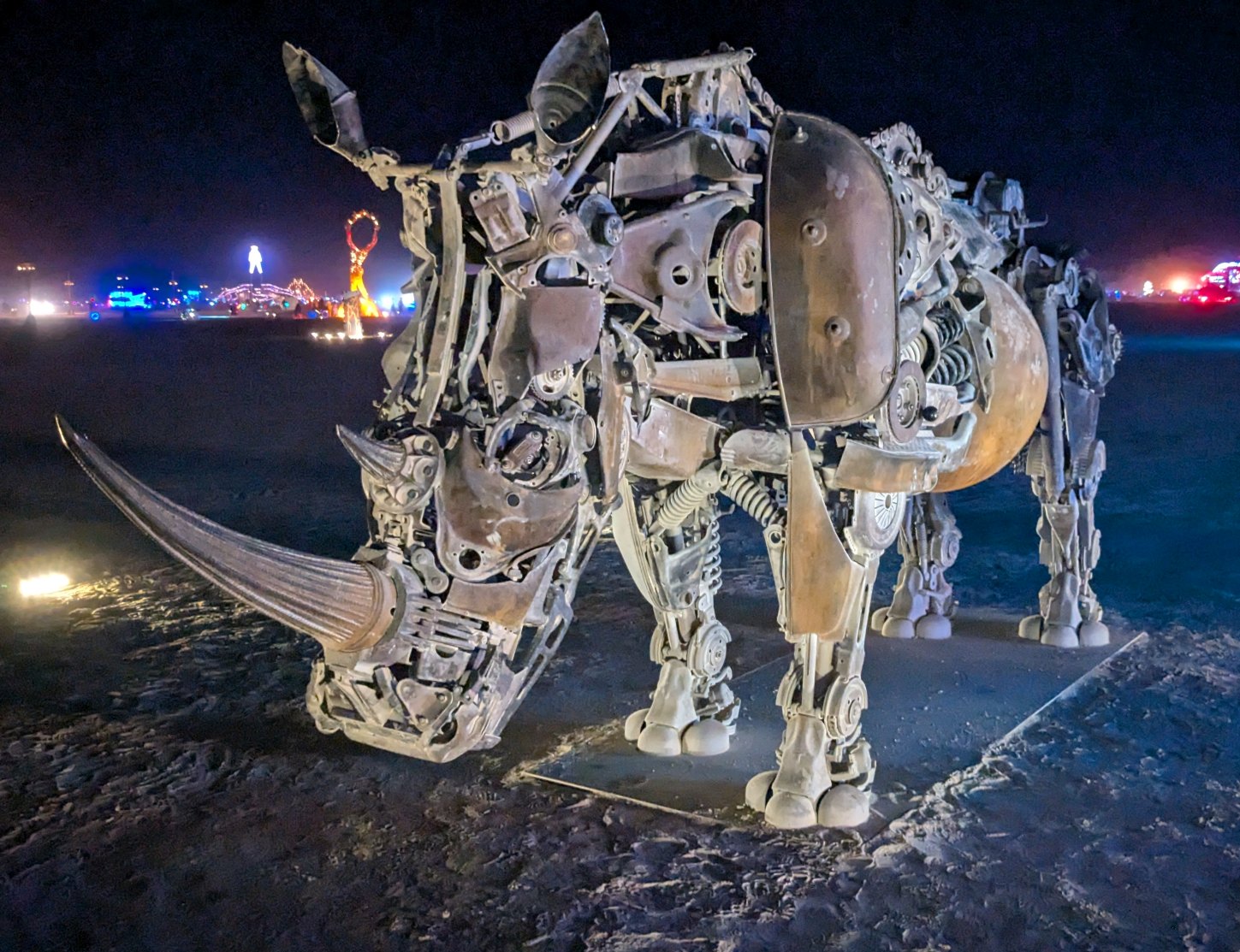 Some sleuthing revealed that the artist, Michael Benisty, is a bit controversial. Apparently his pieces are manufactured in China, shipped to the playa to be erected for “showing,” and then quickly sold profitably to art collectors. This rubs some the wrong way, since the Burning man principles abhor commercialization and commodification of anything, especially art. So it appears that his presence is tolerated but his work was not listed in any of the art guides.