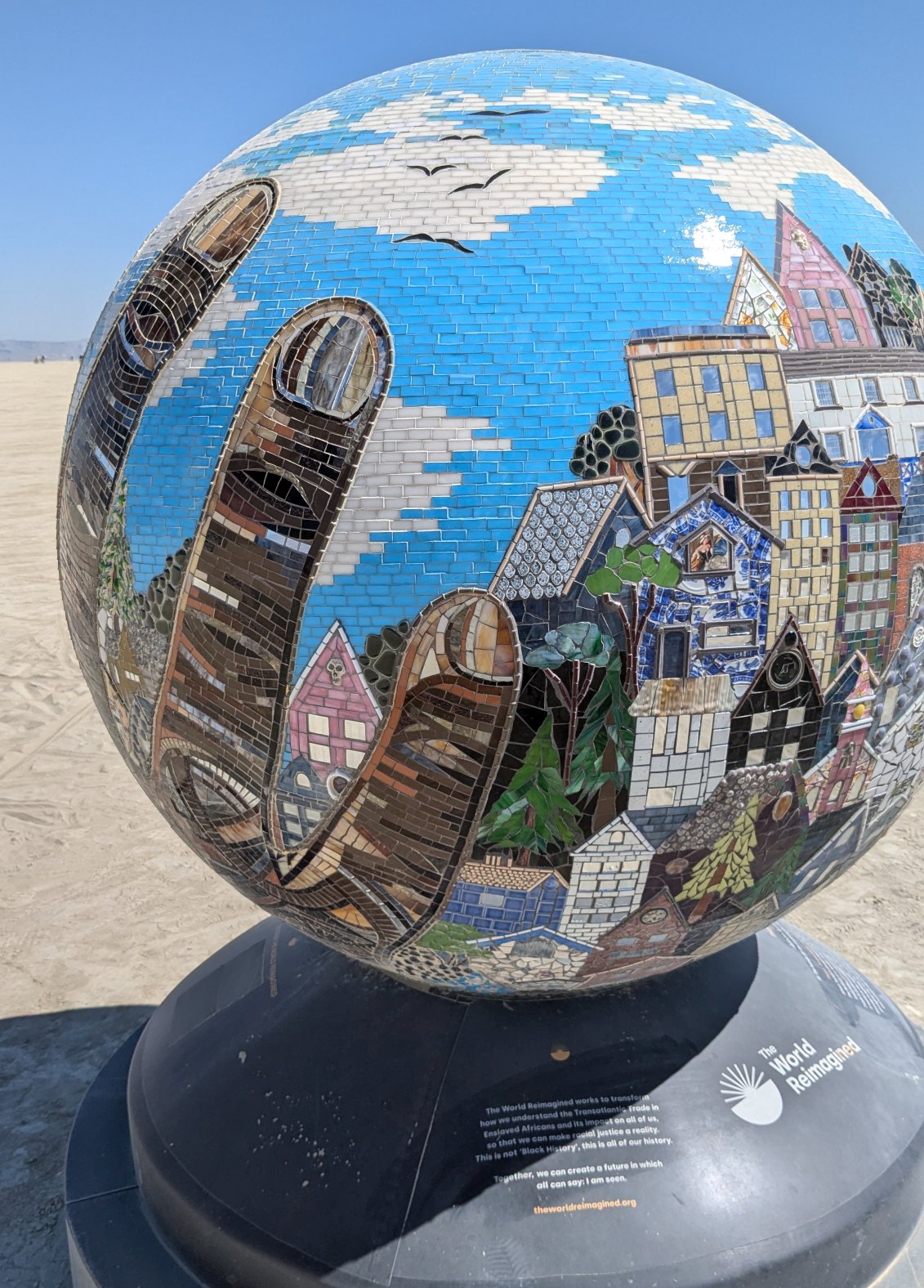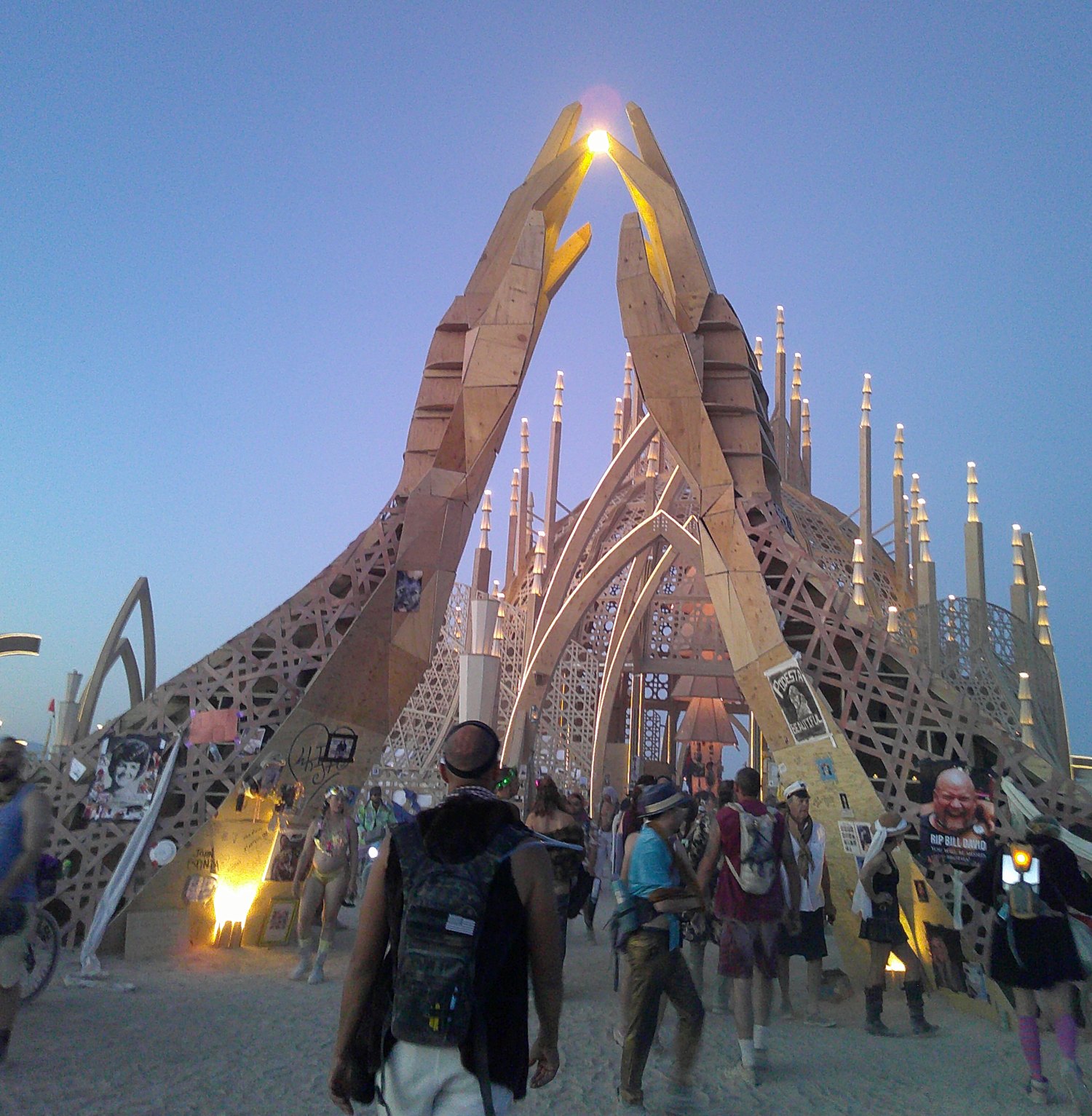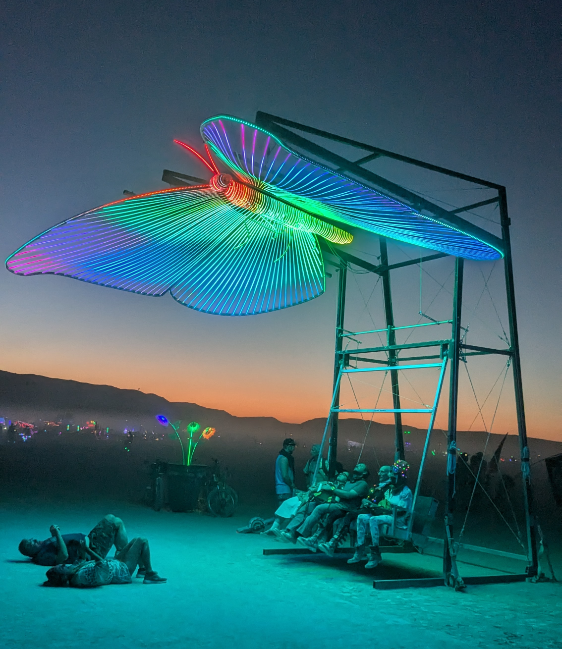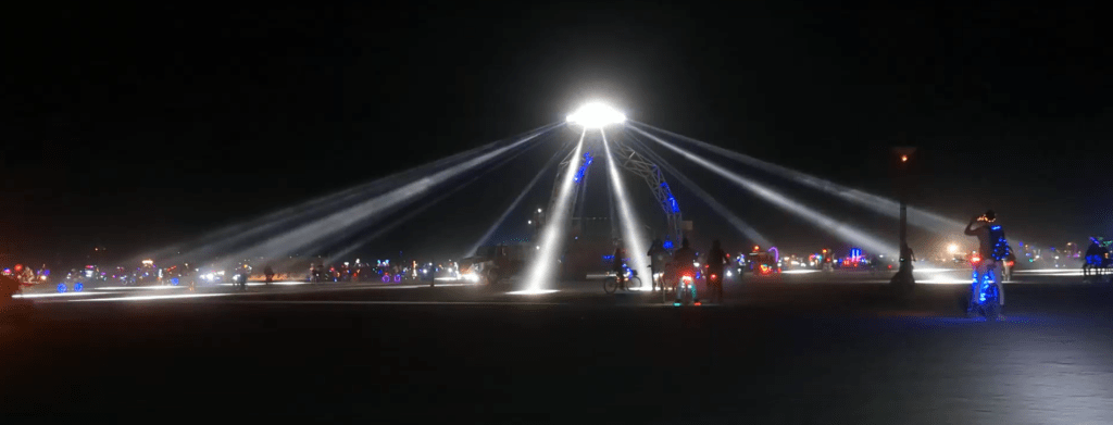 Some sleuthing revealed that the artist, Michael Benisty, is a bit controversial. Apparently his pieces are manufactured in China, shipped to the playa to be erected for “showing,” and then quickly sold profitably to art collectors. This rubs some the wrong way, since the Burning man principles abhor commercialization and commodification of anything, especially art. So it appears that his presence is tolerated but his work was not listed in any of the art guides.