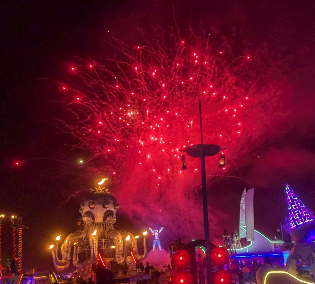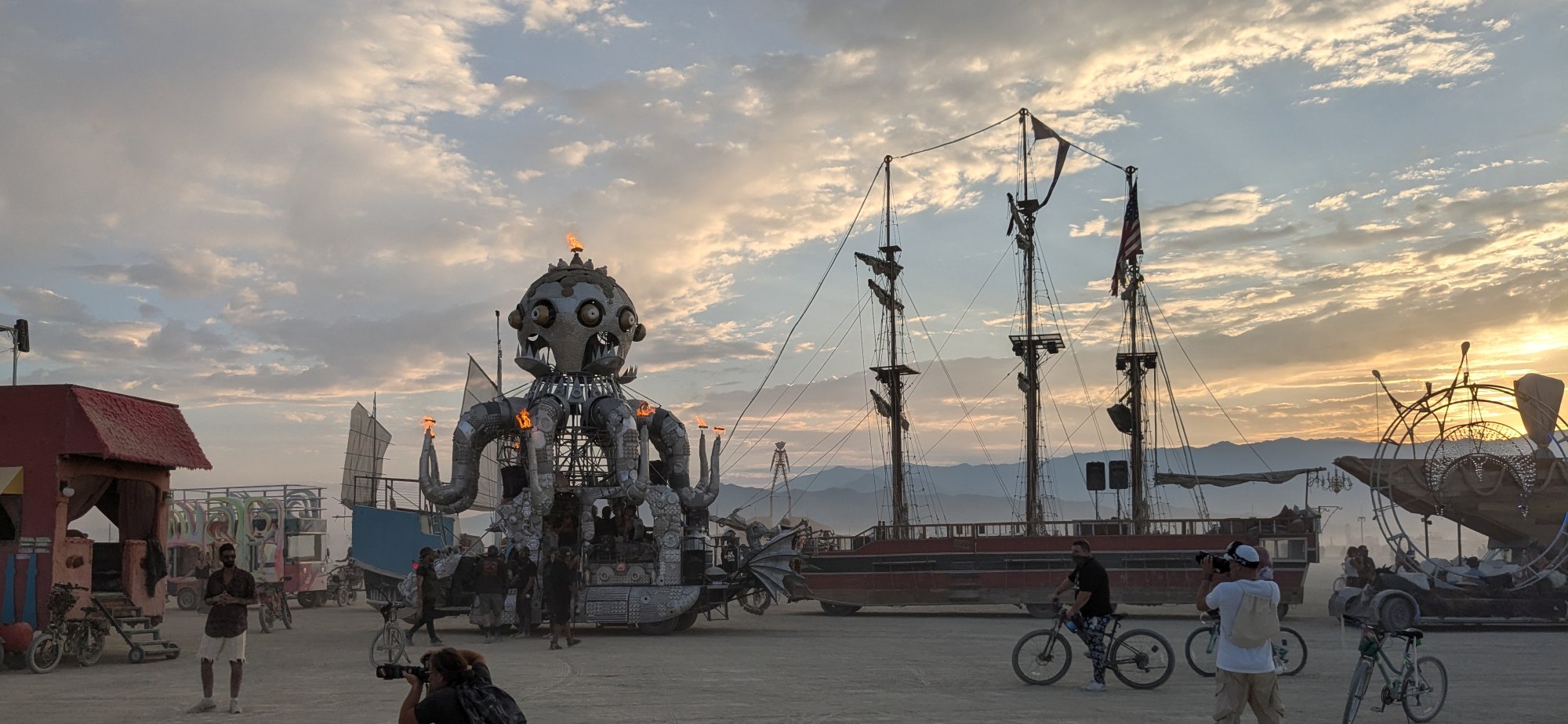 Burn Night was perfect weather and glorious sunset. All the art cars gathered around the Man. We parked ourselves near El Pulpo, the flaming octopus. the mans arms went up at nine o’clock and the fireworks started. Capturing the fireworks is not my specialty, but if you want to see some of the best in the world, google can help you find some nice videos. In the last few years, a giant explosion actually sets the man burning. I resorted to the internet to find the frame in a video that captured that moment. And… he is gone.