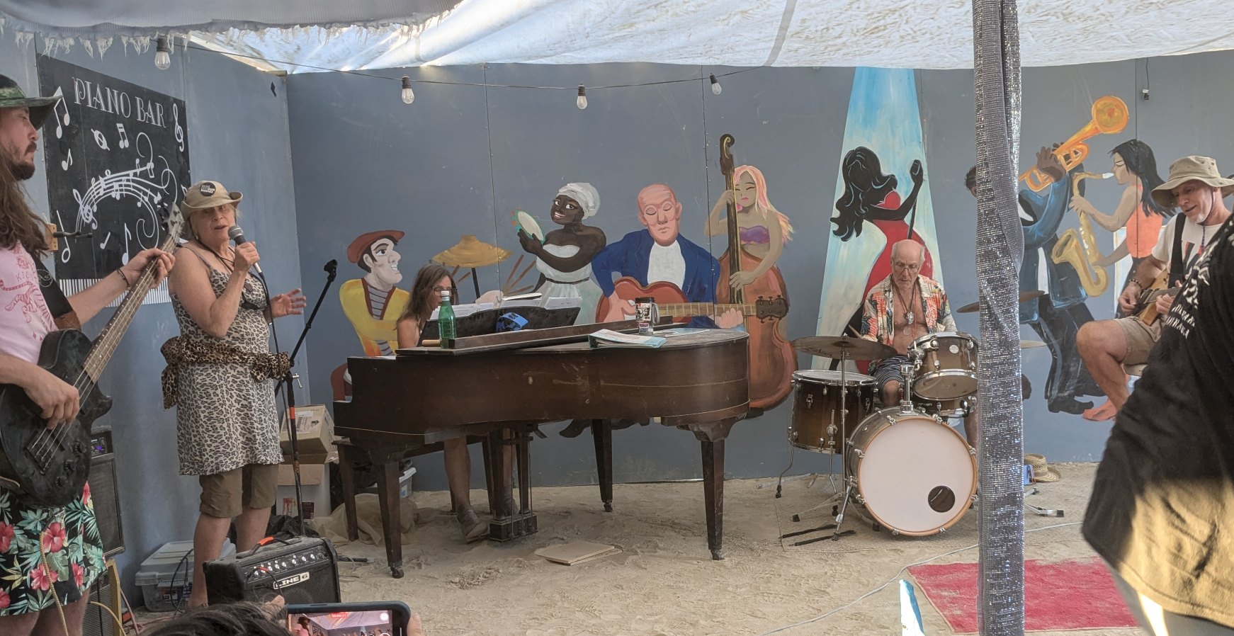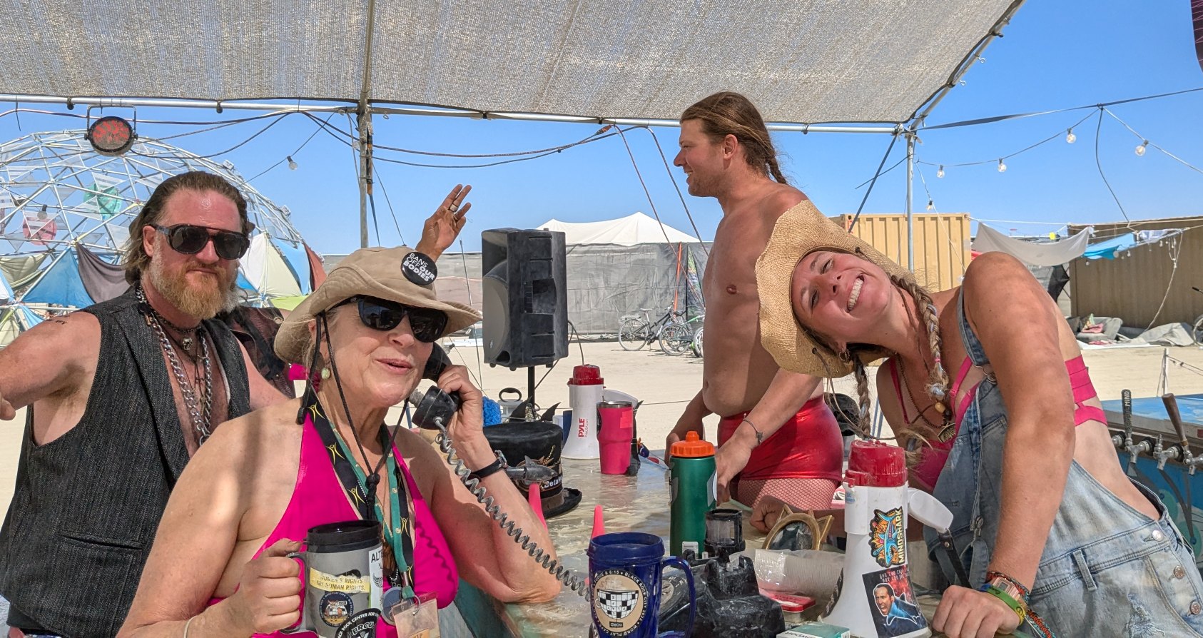 Friends, are where you find them. We met up with old acquaintances and made new ones. Ellen’s musical connections help out, and just about every bar is ready to welcome you on a hot afternoon. Across the street from our camp, I met Dan, K6FJ, a ham radio operator; his tall antennas to help locate our camp at night.