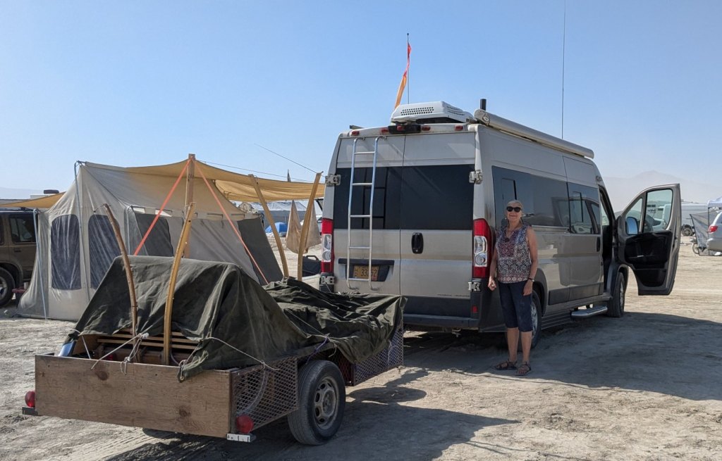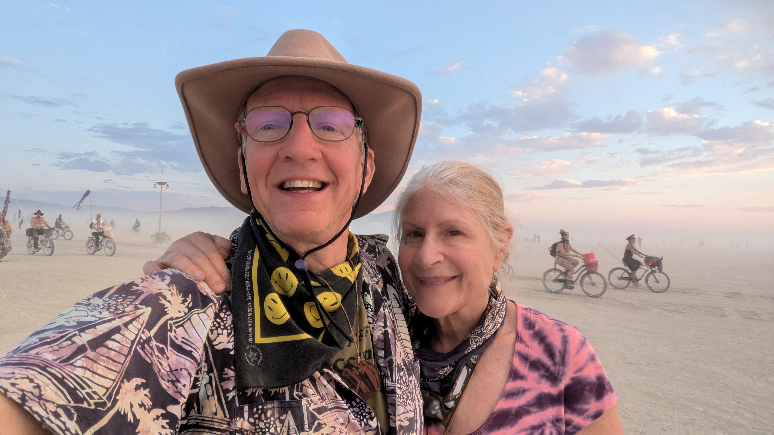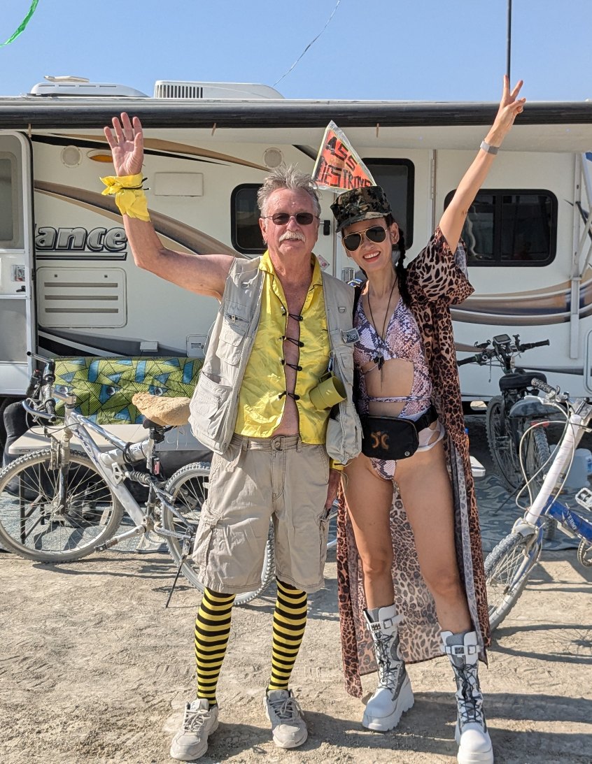 “The temple burn was a white out. When it was over we couldn’t see in any direction. It took a while to find our bikes and we used the GPS to find 5:30 and Esplanade. We had to walk our bikes back. We couldn’t even see people until they were right next to us. We left Monday morning and the winds picked up to over 40 mph. I couldn’t see the car in front of us. Once when the dust cleared I was 4 lanes to the left. I moved over to the far right lane and even the flags along the fence, outside the passenger door, disappeared. If took 5 hrs. to go from the greeters station to the blacktop. Then there was an accident on I-80. It took 14 hrs. to go the 320 miles home. After all this I’m already planning for next year.”