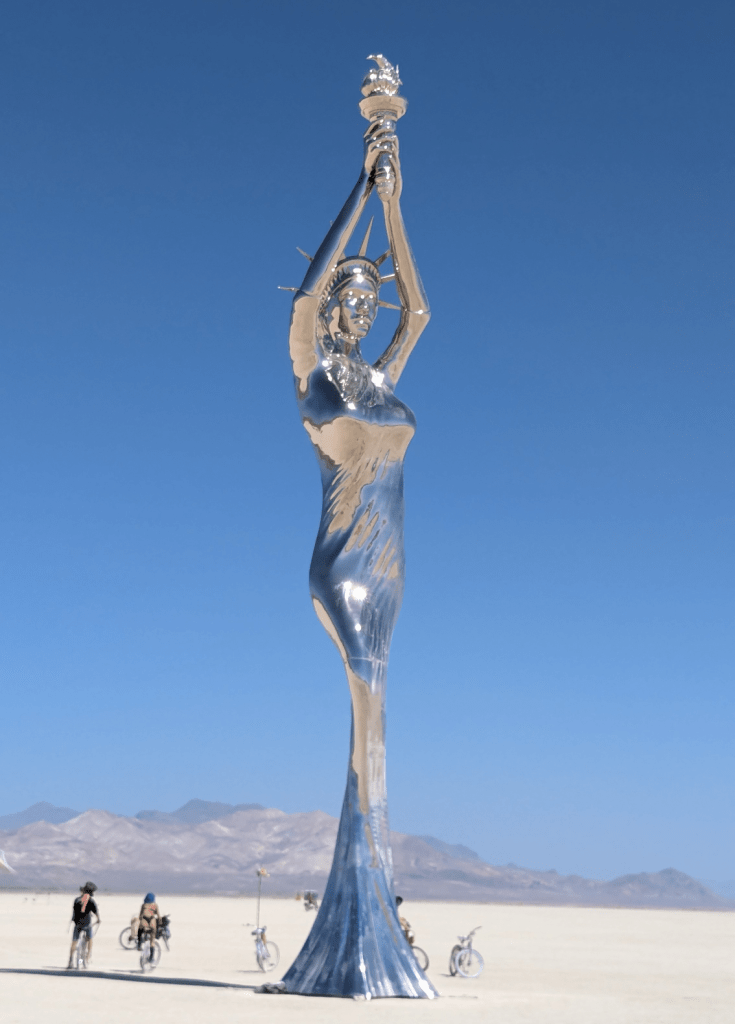 We quickly ran across the very shiny tall “Liberty” statue in deep playa which Ellen dubbed “Miss Liberty on Weight Watchers.” Preparing this blog, I like to go through the Burning Man Art Installations guide to be able to say something about the artists. But “Liberty” was nowhere to be found.