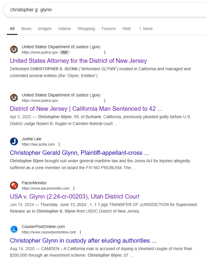 What should come up, but a court document from U.S. District Court in Hawaii, Baldwin vs Wilson. I’m no lawyer, but what this looks like to me an agreement to separate the “Attorney Defendants” who were included in the plaintiff’s complaint from the actual defendants in a lawsuit involving “Defendant Christopher G. Glynn aka Christian J. Hemmann (“Glynn”) and corporate Defendants Geocure Global Hive Cooperative, Purehive Maui Beehab, LLC, Purehive Hawaiian Islands, Inc., and Purehive, Inc. (collectively, the “Hive Defendants”) In a footnote in this document it was noted that Glynn was held at the Federal Correctional Institute Loretto in Cresson, PA. and was released on March 27, 2023. I did not run into any details of the underlying lawsuit in Hawaii, but it seemed to involve some media/computer people. If I were to guess what went on here, Glynn convinced his attorney friend Randon Wilson, who helped with his trademark, to help out again when he got in trouble in Hawaii. Soon thereafter Wilson saw what he was dealing with and wanted nothing to do with Glynn.