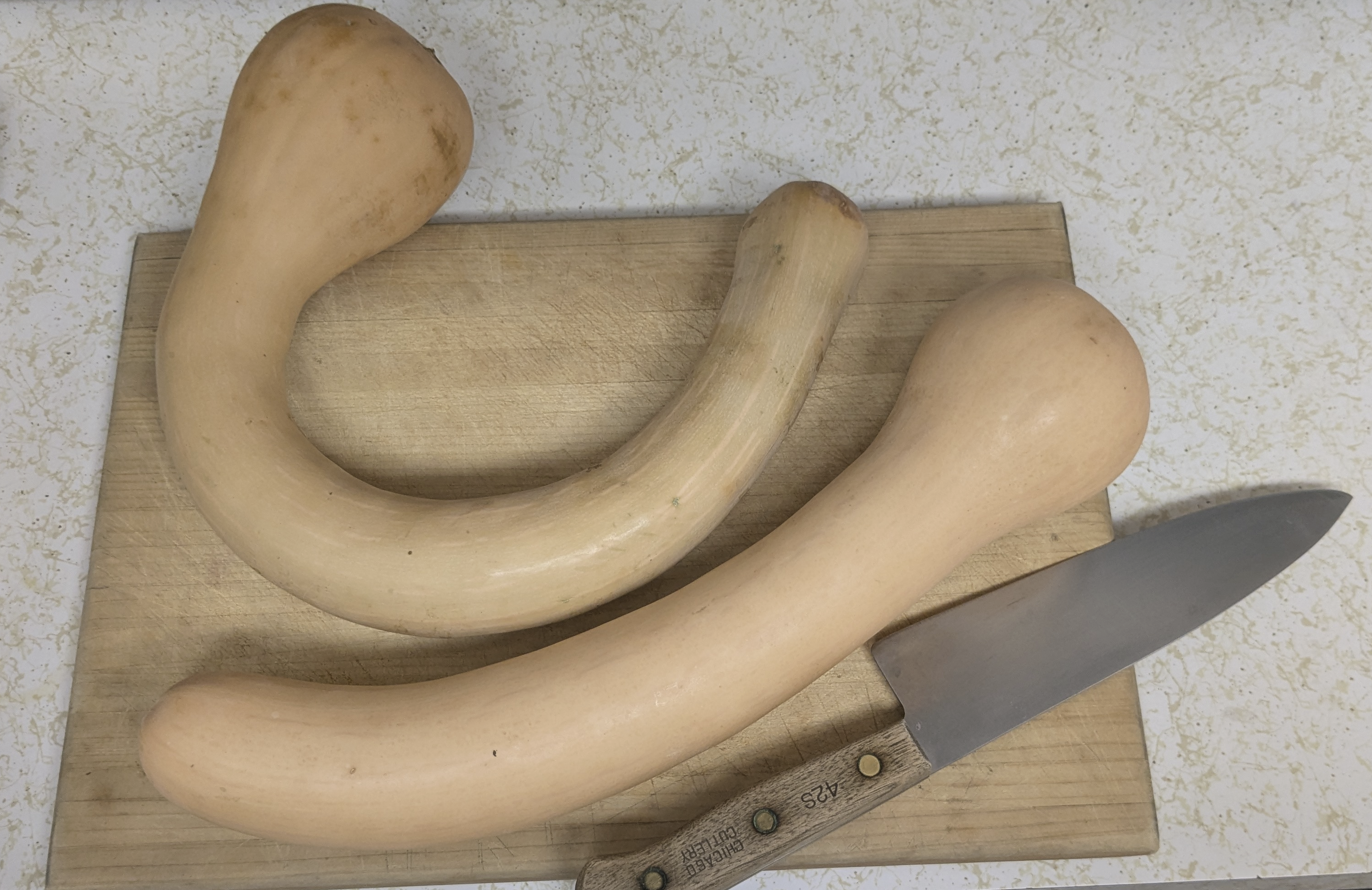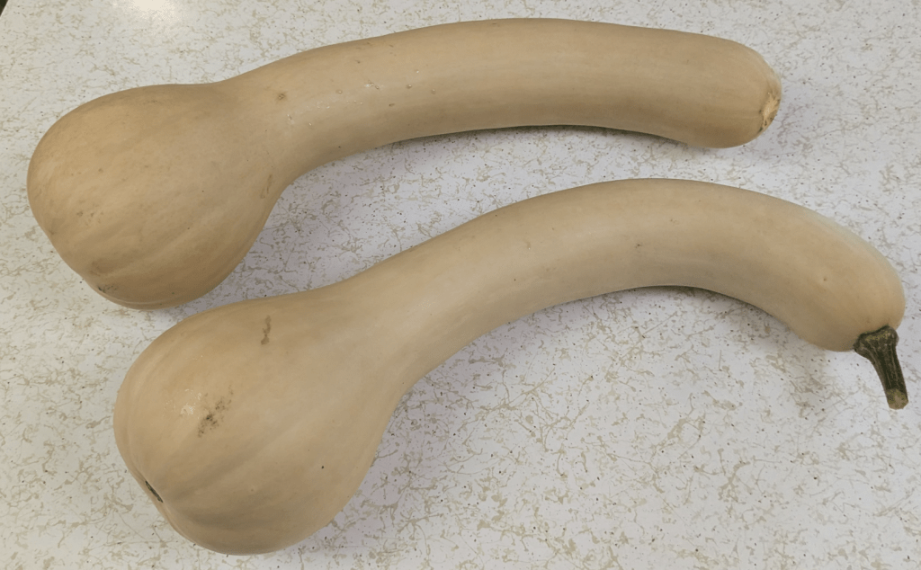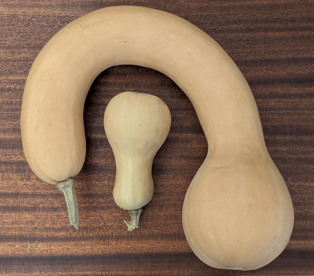 I didn’t deliberately plant any “normal” butternuts this year, but a volunteer showed up in the garden that produced a small late squash for comparison’s sake.