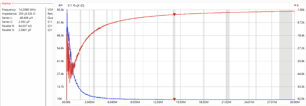 Here I tested a roughly 20 µH coil built on some PCV pipe. I used the clip-lead test jig and ran a sweep of the entire HF spectrum from 5 MHz to 30 MHz. What you immediately see with the NanoVNA S11 impedance sweep is a distinct resonance at about 19.3 MHz. The NanoVNA Saver software lets you to place markers and the software calculates effective series inductance or capacitance for you. I placed the markers at the very low frequency end, on the resonance, and at the high frequency end. At the low frequency end, the coil looks most like an inductor — and the software calculates the value at 21.2 µH. At the high frequency end, the “Series L” is negative — which makes no sense, but the “Series C” is calculated as 2.06 pF. These are good rough values for the inductance and the parallel parasitic capacitance of the coil. You can make another estimate of the parasitic capacitance by using the resonant frequency and the low frequency derived inductance to calculate the capacitance. At 50 kHz, the inductance measured 19.6 µH, the resonance was at 19.35 MHz, so that calculated capacitance will be C=1/[L(2πf)2]C = 1/[L(2πf)^2] = 3.45 pF. This is a better estimate than using the value at the top end of the plotted spectrum because the frequency was not sufficiently high that the inductive reactance was negligible compare to the capacitive reactance. When dealing with such small values of capacitance it is often difficult to generate reproducible results. Just placing the coil in the photo lying with the wires against the wooden table changed the resonant frequency to 18.54 MHz yielding an equivalent capacitance of 3.76 pF. But this stuff happens in real life too. What happens if it rains on you coil? Spray it with water and see!