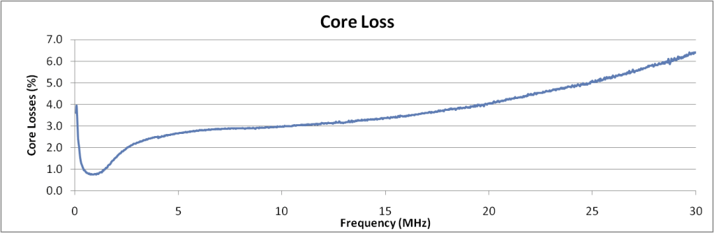 The .sp2 files provide the real and imaginary components for the S11 and S21 parameters at each frequency point. The insertion gain and transmission gain are calculated in the spreadsheet according to the formula above. The core losses are just 1-GT and are plotted above as a percentage of the input power. This can be important if you are concerned about a core overheating. The power loss may be insignificant, but if the core warms up beyond the Curie temperature, it will lose all efficiency and the SWR will increase markedly.
