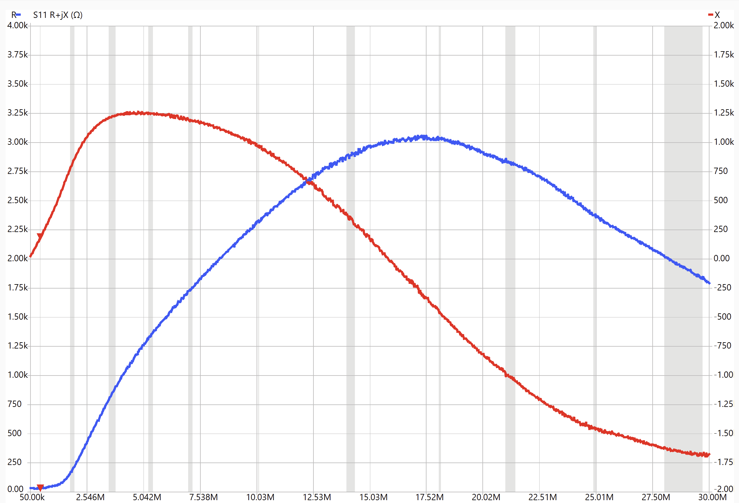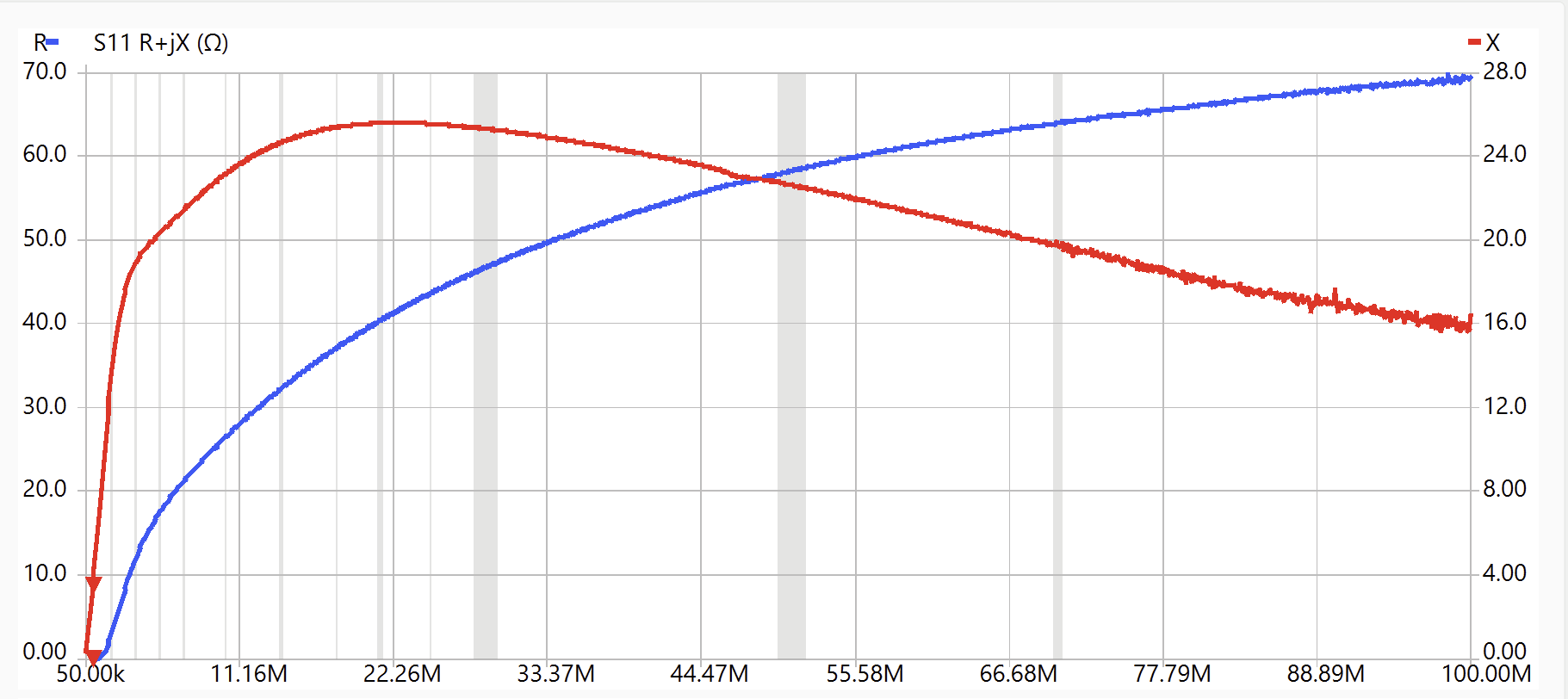 Ferrite manufacturers specify the “complex permeability” of their materials. This is just a frequency dependent complex number, µ that when multiplied with the low frequency core constant and the number of turns squared, will generate the observed complex impedance, R + jX, of the inductor. Since we measured the inductor impedance and know the number of turns, with a little arithmetic we can generate the complex permeability curves. Let’s consider this example with a FairRite core model 5943006401 which is a 1″ O.D. toroid. I calibrated the jig and ran the S11 impedance plot.