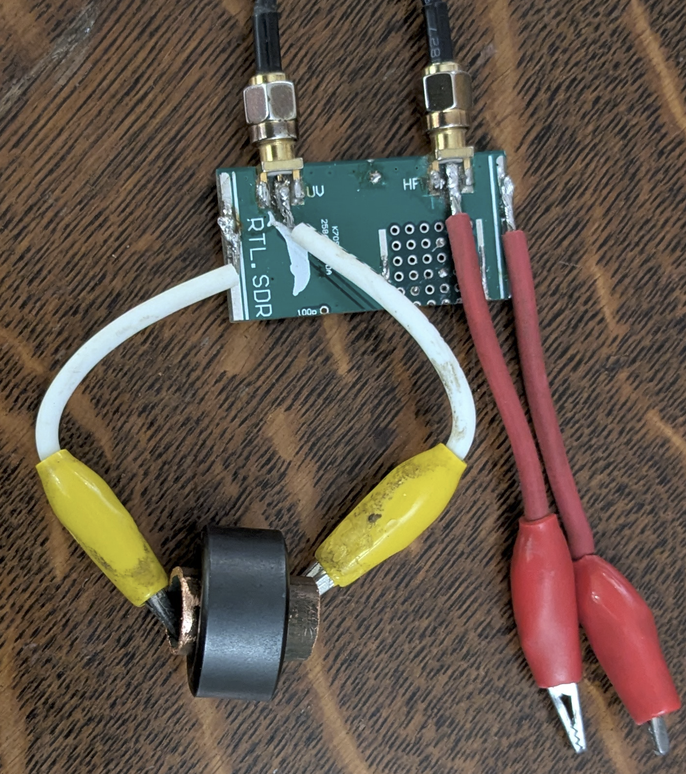 The photo above shows a laptop computer controlling the NanoVNA, here testing an RF transformer using a two-port clip-lead fixture. Also shown is a probe cable that includes a common mode choke to ensure that the clip-leads float, and are not influenced by the ground potential of the laptop and NanoVNA. This is useful when making measurements in the presence of EM fields, like in the near-field of an antenna. Calibration standards and coax adapters that are frequently needed are in the plastic box.