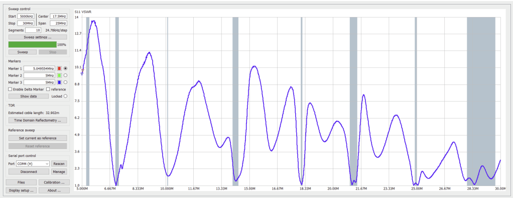 Maybe you want to measure what is going on at the antenna feed-point. This usually means the antenna needs to be installed at height. Reaching the antenna terminals can be a challenge. Recently I was building a vertical wire array. The wire feed points were close enough to the ground that I could reach them on a step ladder. I tried to make a measurement with the clip-lead fixture I use with the NanoVNA. Holding the NanoVNA and the laptop up on the step ladder, I managed to make a few measurements. But I found that whether I put the NanoVNA’s ‘hot’ wire on the upper or lower wire of the antenna changed the way the sweeps looked. It is always a good idea to do the “swap-the-leads check”. If the two sweeps look different then something is wrong. Often the currents are not balanced on the probe coax. This can easily happen if there is capacitive coupling between the antenna and the NanoVNA and/or its connections to the laptop or a grounded power connection. I built a probe cable that included a ferrite loaded inductor to choke off any common mode current. A dozen turns of tiny coax on FT114-43 core made things look right. The instrument was calibrated at the probe clip-leads to ‘calibrate out’ any effect of the long probe’s added cable length.