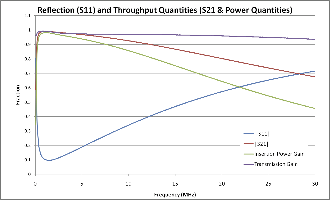 The |S21| plot shows that at low frequency, ~500 kHz, The throughput is very close to one. As the frequency increases the throughput drops off dues to two effects. First, some signal is reflected back to the S11 source as the leakage inductance contributes to a larger fraction of the input impedance. This gives rise to increasing VSWR with frequency. Second, there will be some core losses that contribute to the declining |S21|, which also give rise to heating the core. There are two terms that seek to distinguish these two situations. Insertion Gain (or Loss) is just the power ratio of what goes in from the S11 port to what comes out to the S21 port. This is just |S21|2 since we are dealing with power rather than voltage. Transmission Gain (or Loss) is concerned with power loss within the device under test (DUT), and excludes the S11 input power that is reflected back to the source by any mismatch in coupling to the DUT. Hence any reflected power, |S11|2 must be not be included in the Transmission Gain.
