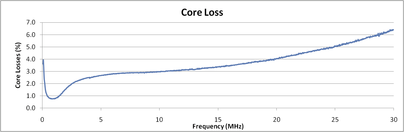 The .sp2 files provide the real and imaginary components for the S11 and S21 parameters at each frequency point. The insertion gain and transmission gain are calculated in the spreadsheet according to the formula above. The core losses are just 1-GT and are plotted above as a percentage of the input power. This can be important if you are concerned about a core overheating. The power loss may be insignificant, but if the core warms up beyond the Curie temperature, it will lose all efficiency and the SWR will increase markedly.