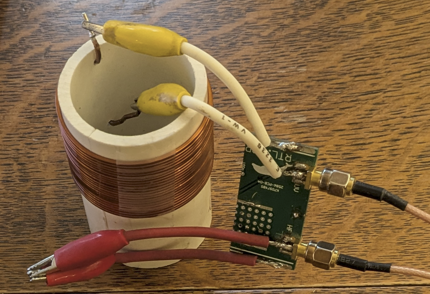 Here I tested a roughly 20 µH coil built on some PCV pipe. I used the clip-lead test jig and ran a sweep of the entire HF spectrum from 5 MHz to 30 MHz. What you immediately see with the NanoVNA S11 impedance sweep is a distinct resonance at about 19.3 MHz. The NanoVNA Saver software lets you to place markers and the software calculates effective series inductance or capacitance for you. I placed the markers at the very low frequency end, on the resonance, and at the high frequency end. At the low frequency end, the coil looks most like an inductor — and the software calculates the value at 21.2 µH. At the high frequency end, the “Series L” is negative — which makes no sense, but the “Series C” is calculated as 2.06 pF. These are good rough values for the inductance and the parallel parasitic capacitance of the coil. You can make another estimate of the parasitic capacitance by using the resonant frequency and the low frequency derived inductance to calculate the capacitance. At 50 kHz, the inductance measured 19.6 µH, the resonance was at 19.35 MHz, so that calculated capacitance will be C=1/[L(2πf)2]C = 1/[L(2πf)^2] = 3.45 pF. This is a better estimate than using the value at the top end of the plotted spectrum because the frequency was not sufficiently high that the inductive reactance was negligible compare to the capacitive reactance. When dealing with such small values of capacitance it is often difficult to generate reproducible results. Just placing the coil in the photo lying with the wires against the wooden table changed the resonant frequency to 18.54 MHz yielding an equivalent capacitance of 3.76 pF. But this stuff happens in real life too. What happens if it rains on you coil? Spray it with water and see!