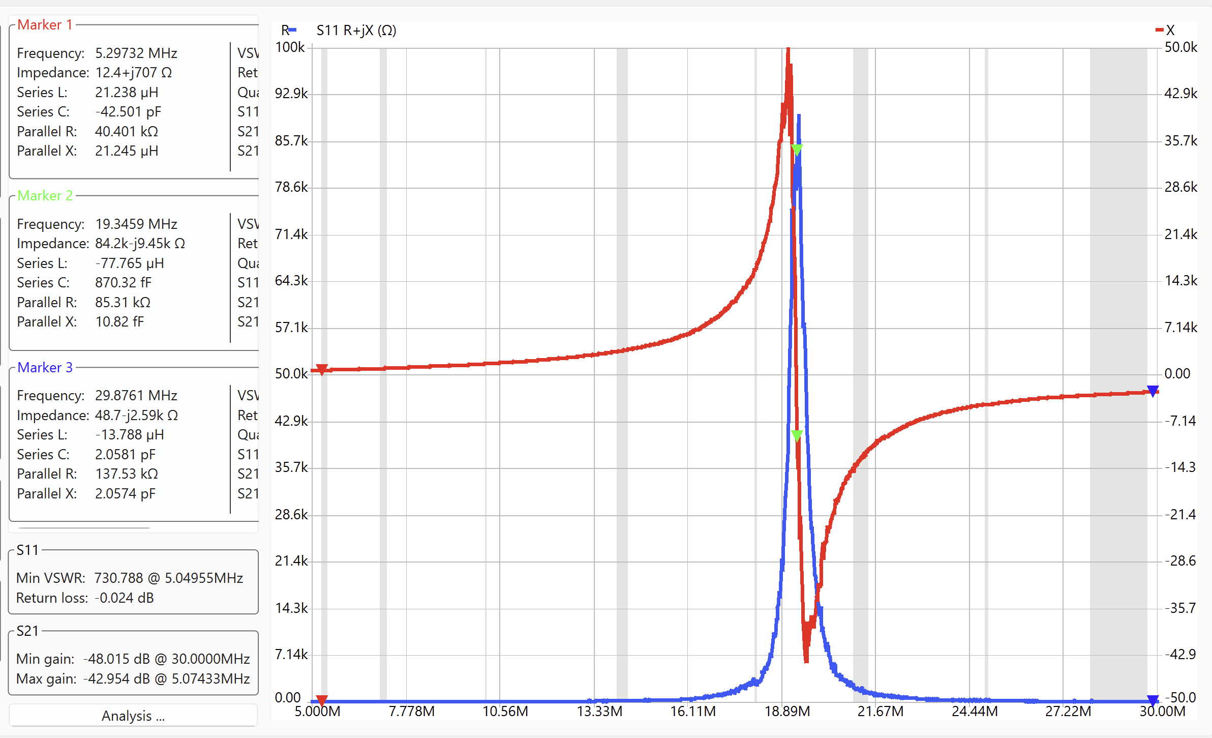 Now let’s look at the throughput with a two-port sweep. The S21 port is a 50 Ω load for the secondary of the transformer. The impedance seen at the primary side by the S11 plot show a real impedance of about 50 Ω and linearly increasing reactance that is consistent with the previously measure leakage inductance of about 580 nH.
