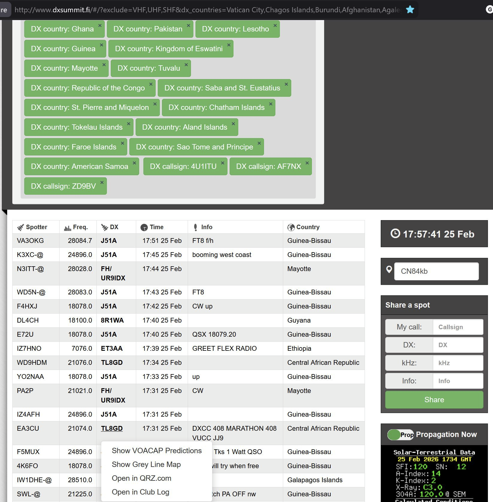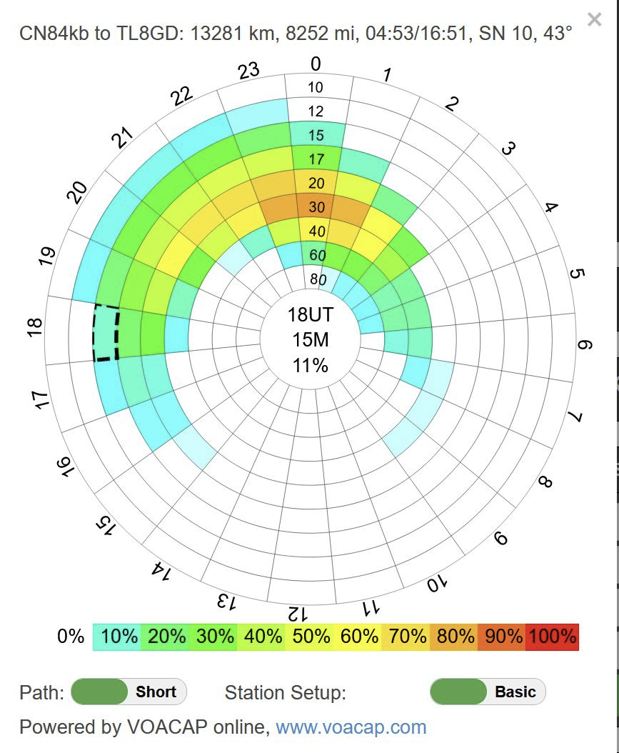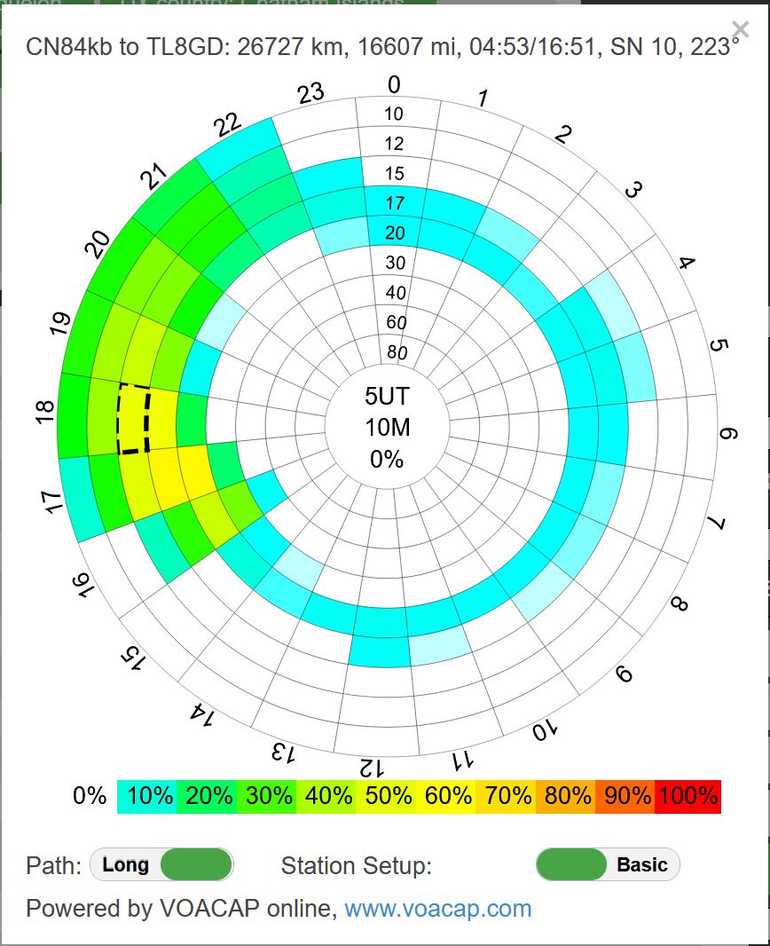 There are some particularly good web-based spotting tools as well. The one I use is DXsummit.fi out of Finland. You can set up a list of countries and call signs as part of the URL when you call up the website and you will just see spots for these wanted entities. Additionally, it supports a VOACAP look-up. VOACAP is a propagation tool developed over the years originally by Voice of America (VOA) that can be very helpful in accessing propagation possibilities with distant places. Clicking on a DX call sign will give you the option to bring up the VOACAP report based on current solar conditions. Then you can check if long path or if short path propagation holds out the most hope, or whether there is really no hope.