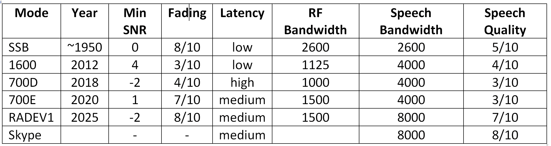 The following table is a guide to the various FREEDV HF modes that have been developed over the years, using analog single-side-band (SSB) and Skype as anchors for a rough guide to audio quality.