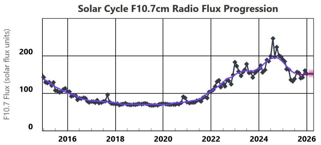 The plot above shows the solar flux. One thing to note is that even during solar minimum and no sun spots on the sun, there is some solar flux, just not enough to create the ionospheric plasma density necessary to reflect any radio waves above about 18 MHz. It is against this backdrop that you have to think about what antennas to deploy and how to use the radio station. When the solar radio flux is low you may be limited to more regional communications on lower bands and with poorer listening quality.