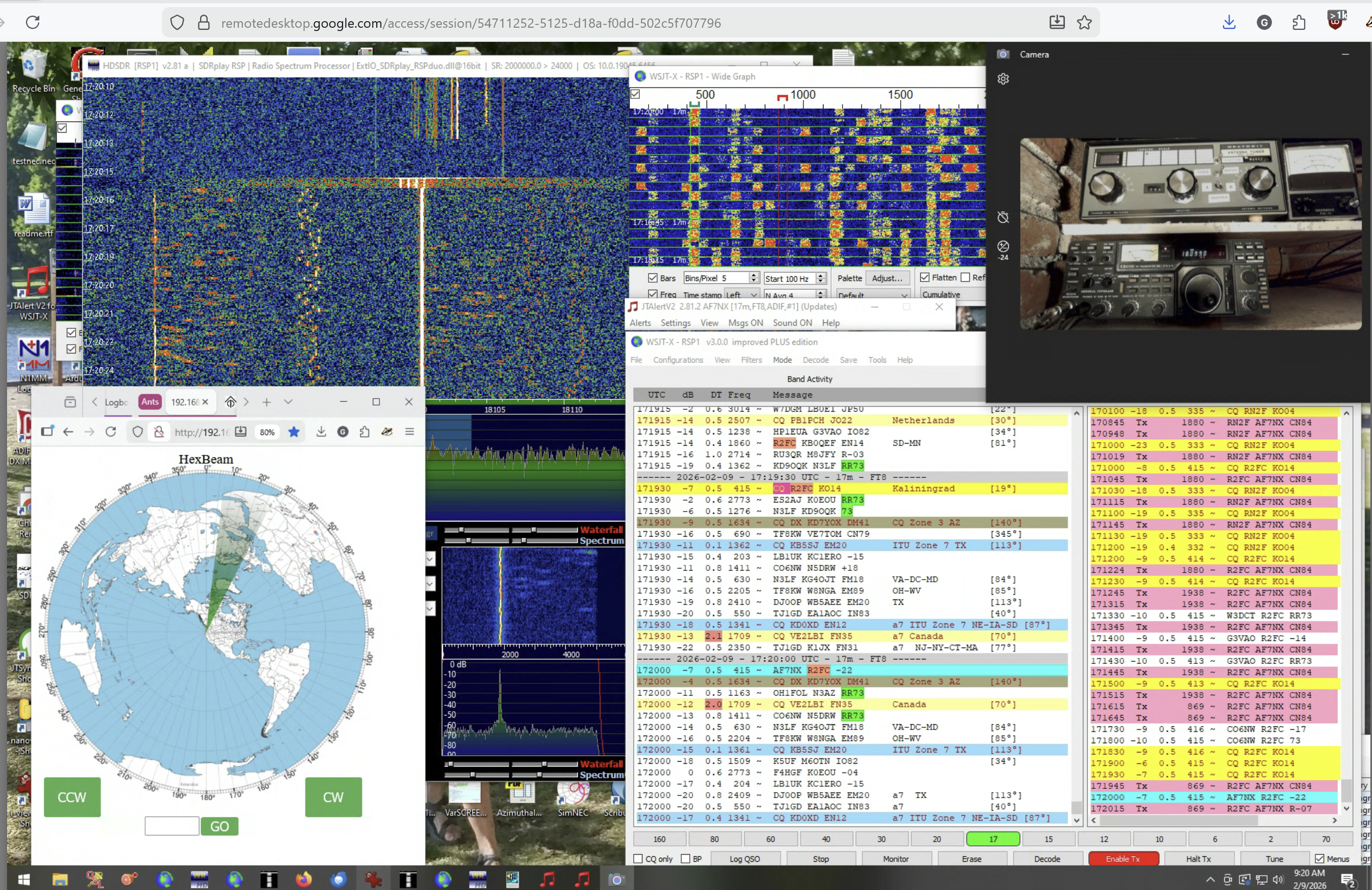 Don’t be complacent. If you are a few feet away and something goes wrong you can smell the smoke and go put out the fire. It is not so easy if you are in another state. My fail safe precautions include a WiFi “Smart Switch” on both the radio AC power and the computer power. I also monitor the HDSDR waterfall which will show the TX waveform. Sometimes I will arrange a video camera to show the radio and the power meters so I can verify expect operation when transmitting. In the remote desktop screen shot below you can see the camera monitoring the radio and power out meter, HDSDR during transmission with the transmission spectrum visible, and the antenna control browser pane with the antenna aimed at Europe where I was working. The screen display on the laptop is a little cramped but easily workable. Using the Remote Desktop app on a phone takes a little practice and patience, but you can make FT8 contacts that way if you really need to.