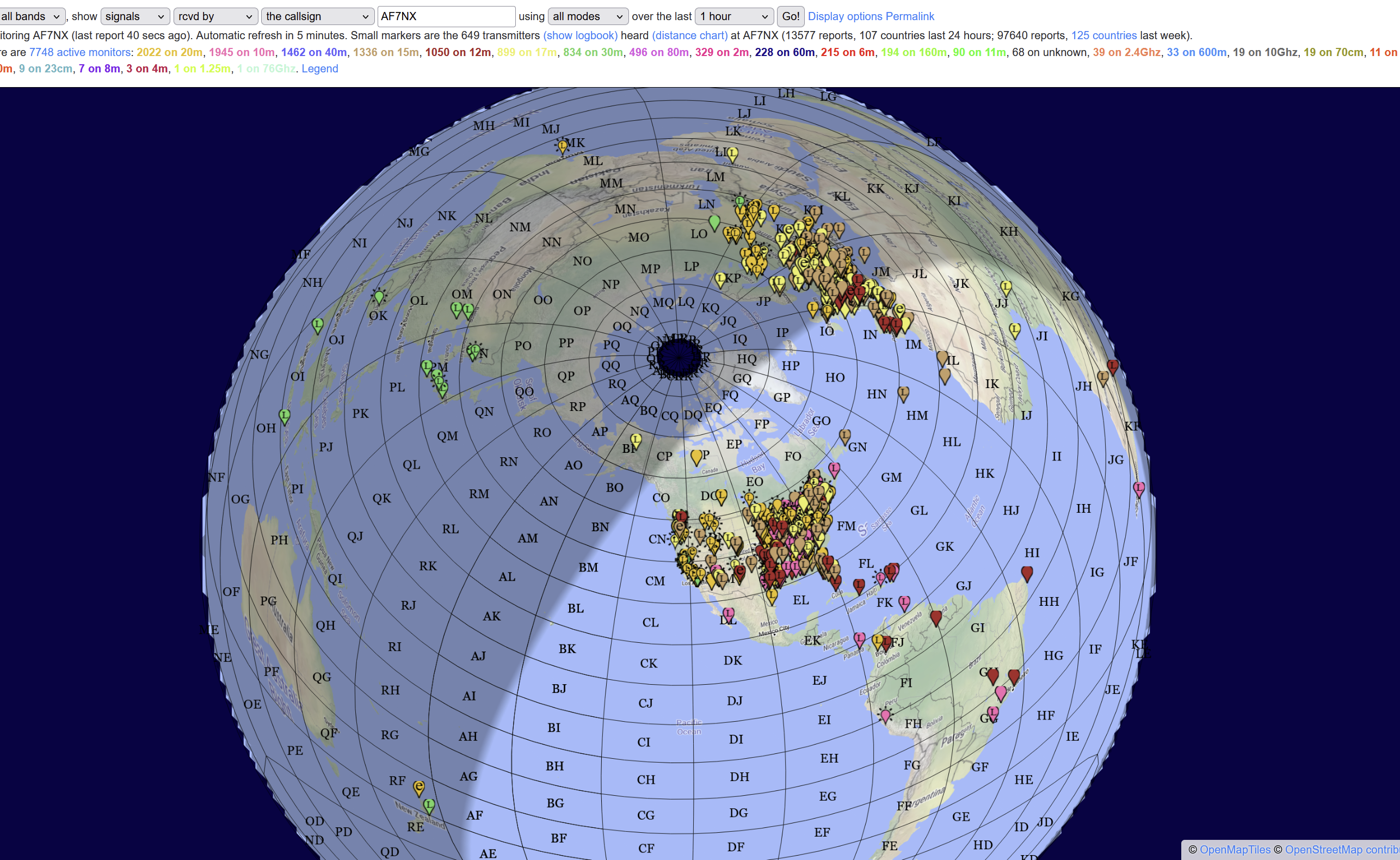As the day progresses you can watch as one band gives way to another. If you are playing the DX game, looking for a contact in Eastern Europe and there are no spots on any band from Europe, you might want to go read a book rather than play radio! I gauge general propagation conditions by the total number of received spots I’m seeing an hour. If it is above 1000 spots/hour, that is usually a pretty good time to be on the air.