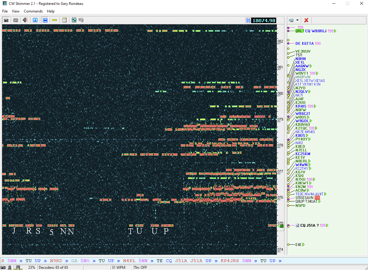 A couple of years ago I went a step further on the software front and started using CW Skimmer, by Alex Shovkoplyas VE3NEA. Alex and his Afreet Software company has contributed mightily to the ham radio community, with among other things, his OmniRig software package for computer communication with many different radios. CW Skimmer can simultaneously decode dozens of CW streams, it will displays call signs it discovers for the streams, and watches for “CQ”s and the classic “5NN” acknowledgement. All this information, for a broad swath of frequencies, makes it possible to work much more efficiently during contests. The “5NN” acknowledgements allows you to discern where DX stations working a pile-up in split mode are actually listening, so you can position you transmissions where you are more likely to be heard.