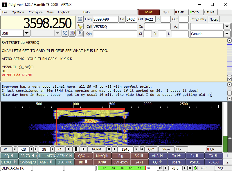The OLIVIA variety shown in the image is OLIVIA-16/1K, which means there are 16 channels space across 1K of audio spectrum. This is a good variety with a pretty quick character speed for chatting. If conditions are less favorable then OLIVIA-8/250 is much slower but has much better noise performance, to the point that the signal can be barely visible on the waterfall and you will still get good copy, albeit at a glacial pace.
