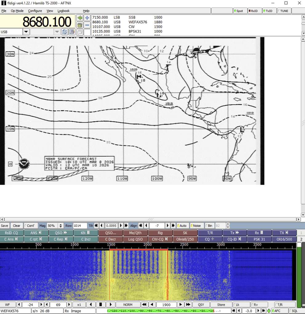 FLDIGI has some modems for signals you will find outside the ham bands as well. One of the most interesting is the WEFAX modems that can be used to generate the images sent by weather fax stations around the world. This is probably one of the more useful things I can do with my radios. As the pages and images come in they are automatically stored in a folder. I can run one of the SDR’s just looking at a WEFAX station and always have the most updated weather info available.