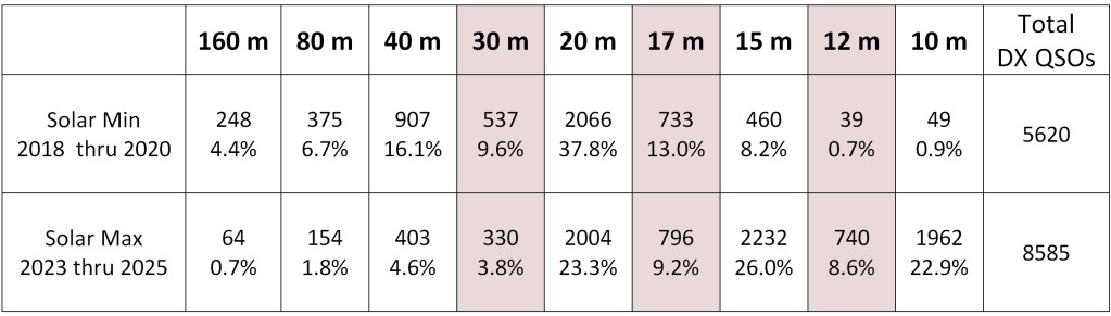 I looked back at my log to see on what bands I made the most contacts outside the United States (DX QSOs), comparing the years of solar minimum with the last few years near solar maximum. Radio contests are restricted on the WARC bands, shaded in the table below, so those bands will have somewhat fewer contacts in general.