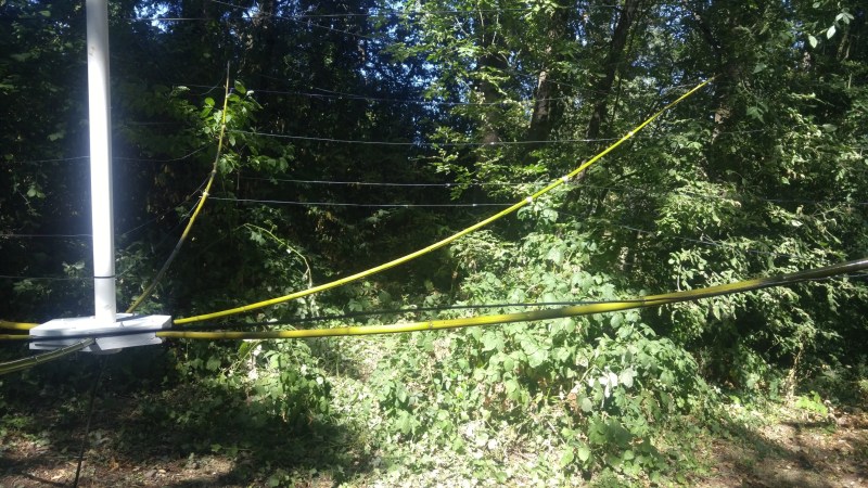 This is a full size inverted L antenna that is designed to be pulled up into some tall trees. The three-band design makes it a good multi-purpose low band antenna,